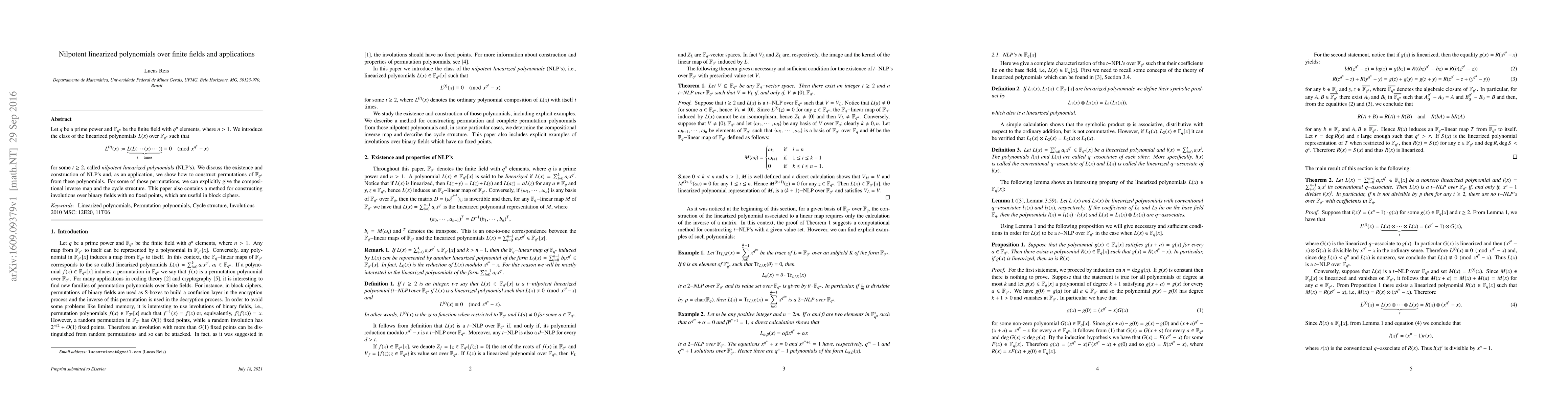 This paper introduces nilpotent linearized polynomials (NLP's) over finite fields, which satisfy specific conditions involving repeated application until equivalence to zero. It discusses their existence, construction, and applications, including constructing permutations with explicit inverses and cycle structures, and involutions over binary fields for block ciphers.