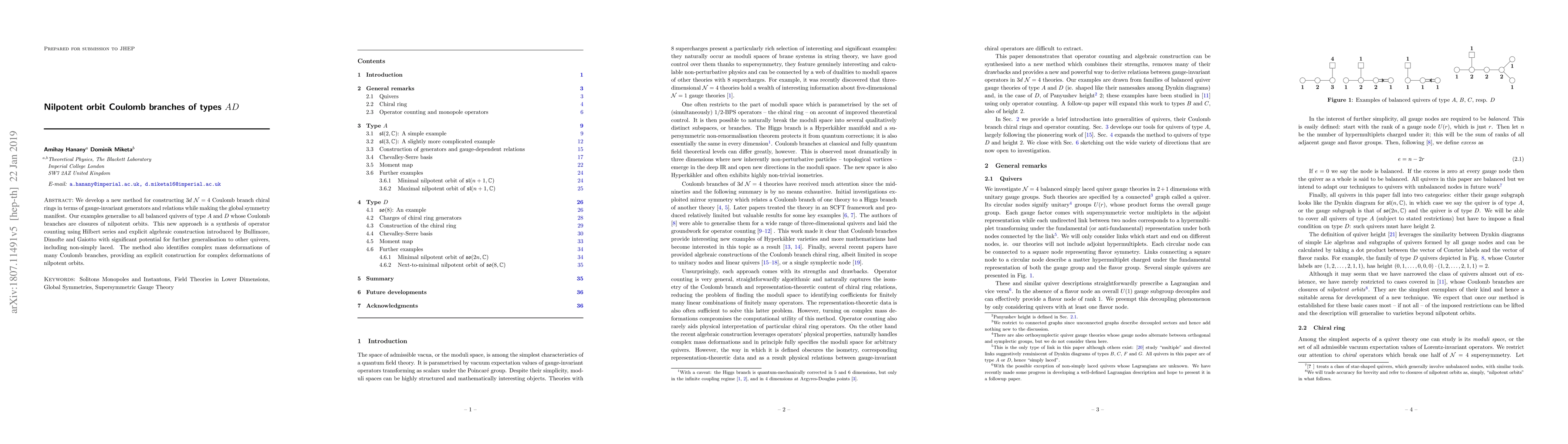 We develop a new method for constructing $3d$ $\mathcal{N}=4$ Coulomb branch chiral rings in terms of gauge-invariant generators and relations while making the global symmetry manifest. Our examples generalise to all balanced quivers of type $A$ and $D$ whose Coulomb branches are closures of nilpotent orbits. This new approach is a synthesis of operator counting using Hilbert series and explicit algebraic construction introduced by Bullimore, Dimofte and Gaiotto with significant potential for further generalisation to other quivers, including non-simply laced. The method also identifies complex mass deformations of many Coulomb branches, providing an explicit construction for complex deformations of nilpotent orbits.