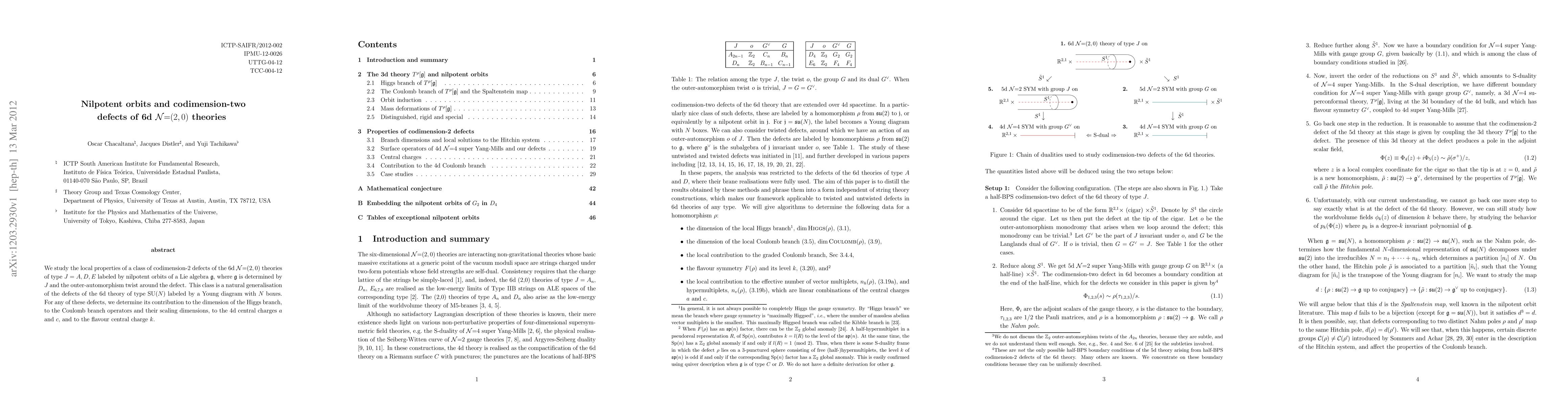 We study the local properties of a class of codimension-2 defects of the 6d N=(2,0) theories of type J=A,D,E labeled by nilpotent orbits of a Lie algebra \mathfrak{g}, where \mathfrak{g} is determined by J and the outer-automorphism twist around the defect. This class is a natural generalisation of the defects of the 6d theory of type SU(N) labeled by a Young diagram with N boxes. For any of these defects, we determine its contribution to the dimension of the Higgs branch, to the Coulomb branch operators and their scaling dimensions, to the 4d central charges a and c, and to the flavour central charge k.