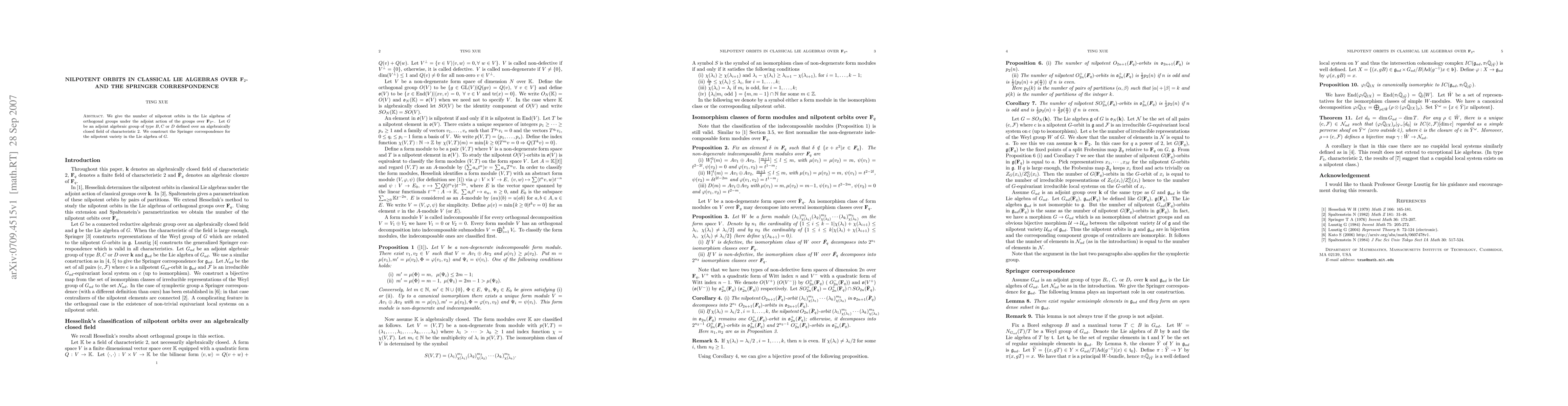 We give the number of nilpotent orbits in the Lie algebras of orthogonal groups under the adjoint action of the groups over $\tF_{2^n}$. Let $G$ be an adjoint algebraic group of type $B,C$ or $D$ defined over an algebraically closed field of characteristic 2. We construct the Springer correspondence for the nilpotent variety in the Lie algebra of $G$.