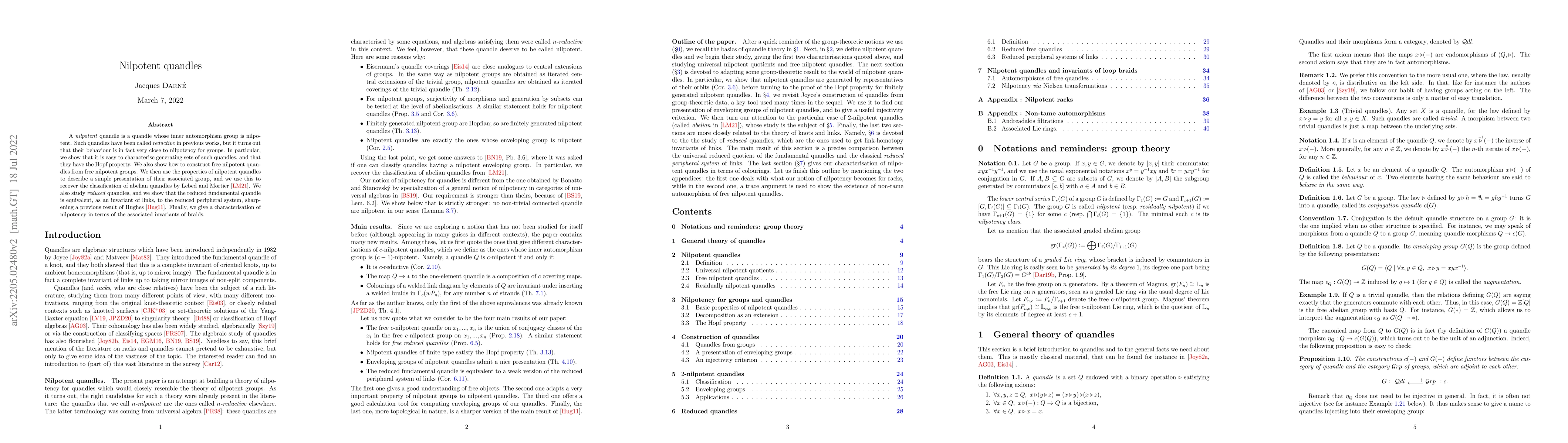 A nilpotent quandle is a quandle whose inner automorphism group is nilpotent. Such quandles have been called reductive in previous works, but it turns out that their behaviour is in fact very close to nilpotency for groups. In particular, we show that it is easy to characterise generating sets of such quandles, and that they have the Hopf property. We also show how to construct free nilpotent quandles from free nilpotent groups. We then use the properties of nilpotent quandles to describe a simple presentation of their associated group, and we use this to recover the classification of abelian quandles by Lebed and Mortier [LM21]. We also study reduced quandles, and we show that the reduced fundamental quandle is equivalent, as an invariant of links, to the reduced peripheral system, sharpening a previous result of Hughes [Hug11]. Finally, we give a characterisation of nilpotency in terms of the associated invariants of braids.