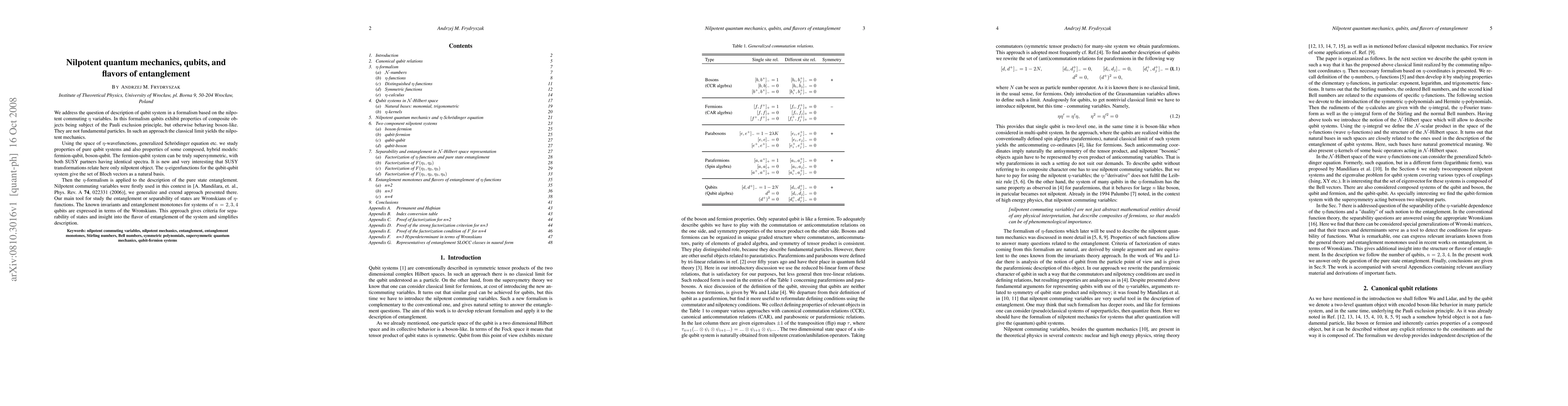 We address the question of description of qubit system in a formalism based on the nilpotent commuting variables. In this formalism qubits exhibit properties of composite objects being subject of the Pauli exclusion principle, but otherwise behaving boson-like. They are not fundamental particles. In such an approach the classical limit yields the nilpotent mechanics. Using the space of $\eta$-wavefunctions, generalized Schr\"{o}dinger equation etc. we study properties of pure qubit systems and also properties of some composed, hybrid models: fermion-qubit, boson-qubit. The fermion-qubit system can be truly supersymmetric, with both SUSY partners having identical spectra. It is new and very interesting that SUSY transformations relate here only nilpotent object. The $\eta$-eigenfunctions for the qubit-qubit system give the set of Bloch vectors as a natural basis. Then the $\eta$-formalism is applied to the description of the pure state entanglement. Nilpotent commuting variables were firstly used in this context in [A. Mandilara, et. al., Phys. Rev. A \textbf{74}, 022331 (2006)], we generalize and extend approach presented there. Our main tool for study the entanglement or separability of states are Wronskians of $\eta$-functions. The known invariants and entanglement monotones for systems of $n=2,3,4$ qubits are expressed in terms of the Wronskians. This approach gives criteria for separability of states and insight into the flavor of entanglement of the system and simplifies description.