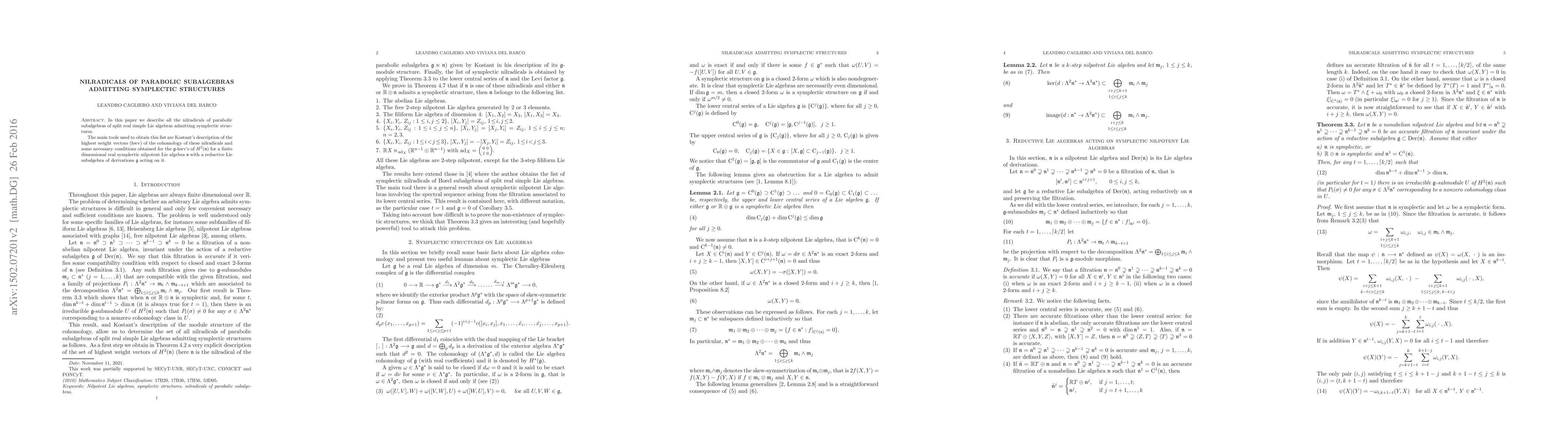 This paper identifies all nilradicals of parabolic subalgebras in split real simple Lie algebras with symplectic structures, utilizing Kostant's highest weight vector description and conditions for $\mathfrak g$-hwv's in $H^2(\mathfrak n)$ for specific symplectic nilpotent Lie algebras.