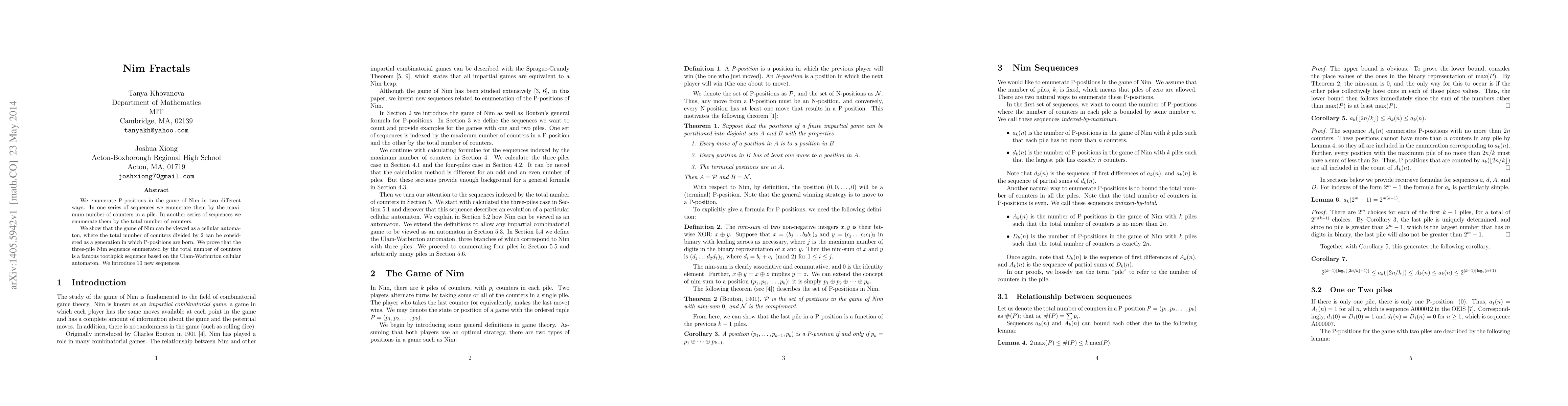 This paper enumerates P-positions in the game of Nim by the maximum number of counters in a pile and by the total number of counters, revealing a cellular automaton perspective. It establishes a connection between the three-pile Nim sequence and the Ulam-Warburton sequence, and introduces 10 new sequences.