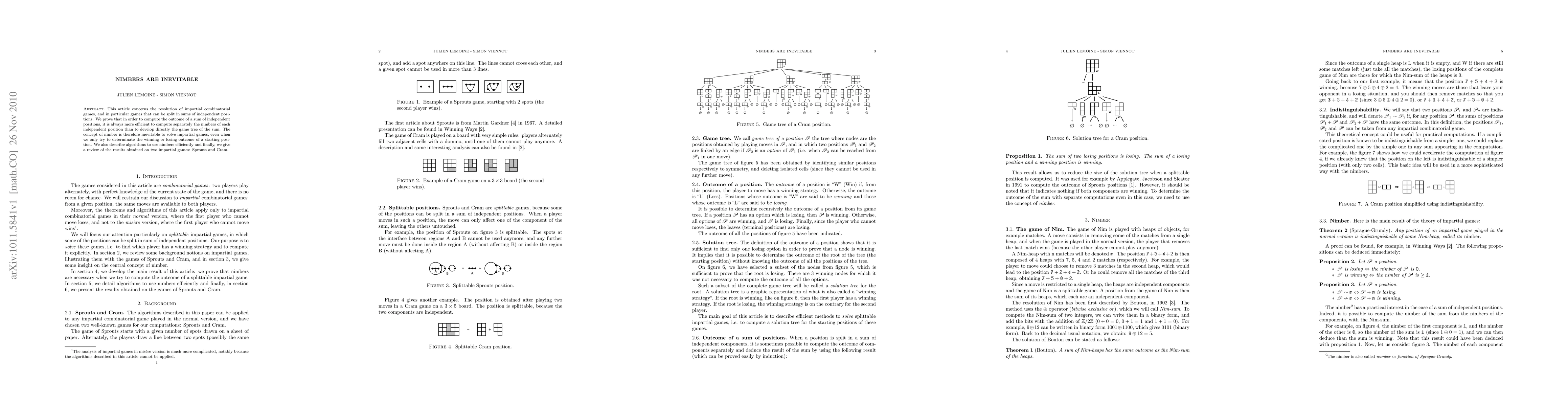 This article concerns the resolution of impartial combinatorial games, and in particular games that can be split in sums of independent positions. We prove that in order to compute the outcome of a sum of independent positions, it is always more efficient to compute separately the nimbers of each independent position than to develop directly the game tree of the sum. The concept of nimber is therefore inevitable to solve impartial games, even when we only try to determinate the winning or losing outcome of a starting position. We also describe algorithms to use nimbers efficiently and finally, we give a review of the results obtained on two impartial games: Sprouts and Cram.