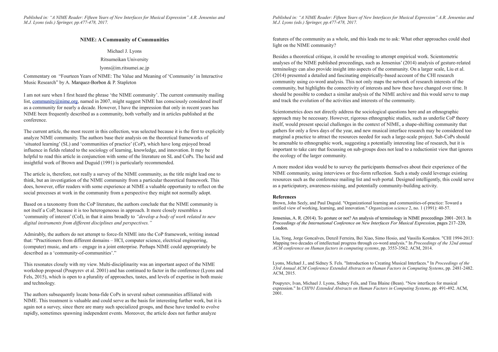 Commentary on the article Fourteen Years of NIME: The Value and Meaning of Community in Interactive Music Research by A. Marquez-Borbon and P. Stapleton.