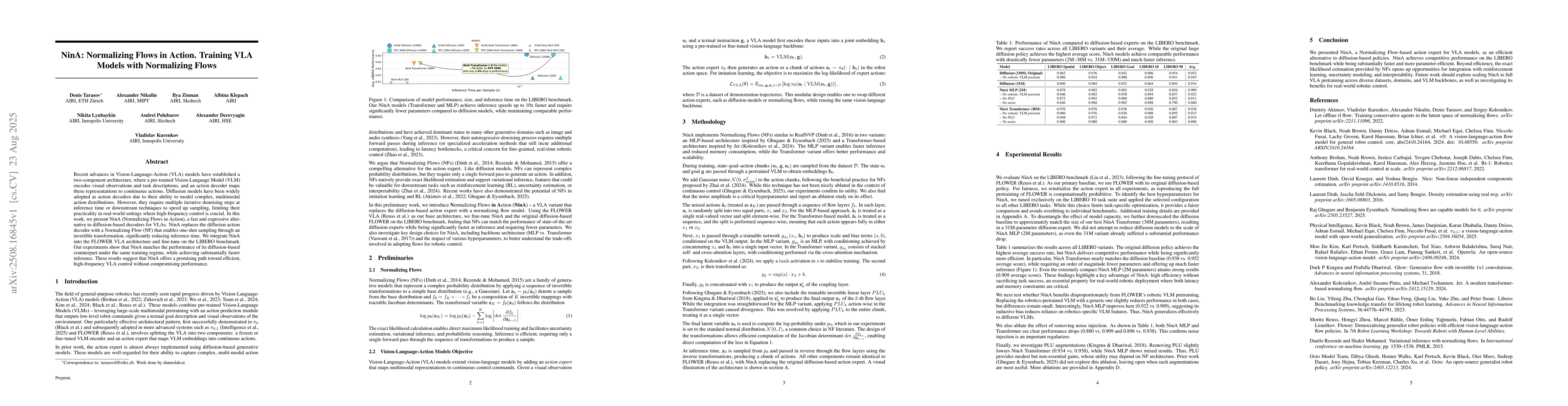 Recent advances in Vision-Language-Action (VLA) models have established a two-component architecture, where a pre-trained Vision-Language Model (VLM) encodes visual observations and task descriptions, and an action decoder maps these representations to continuous actions. Diffusion models have been widely adopted as action decoders due to their ability to model complex, multimodal action distributions. However, they require multiple iterative denoising steps at inference time or downstream techniques to speed up sampling, limiting their practicality in real-world settings where high-frequency control is crucial. In this work, we present NinA (Normalizing Flows in Action), a fast and expressive alter- native to diffusion-based decoders for VLAs. NinA replaces the diffusion action decoder with a Normalizing Flow (NF) that enables one-shot sampling through an invertible transformation, significantly reducing inference time. We integrate NinA into the FLOWER VLA architecture and fine-tune on the LIBERO benchmark. Our experiments show that NinA matches the performance of its diffusion-based counterpart under the same training regime, while achieving substantially faster inference. These results suggest that NinA offers a promising path toward efficient, high-frequency VLA control without compromising performance.