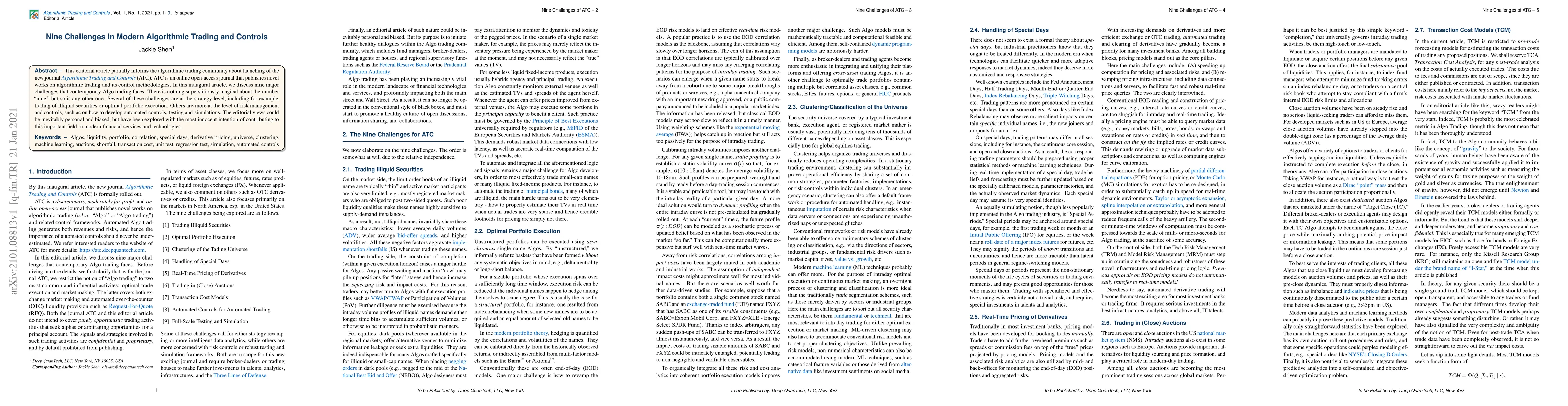 A new journal, Algorithmic Trading and Controls, identifies nine major challenges in modern algorithmic trading, including strategy-level issues and risk management concerns, with the goal of contributing to the field of algorithmic trading.