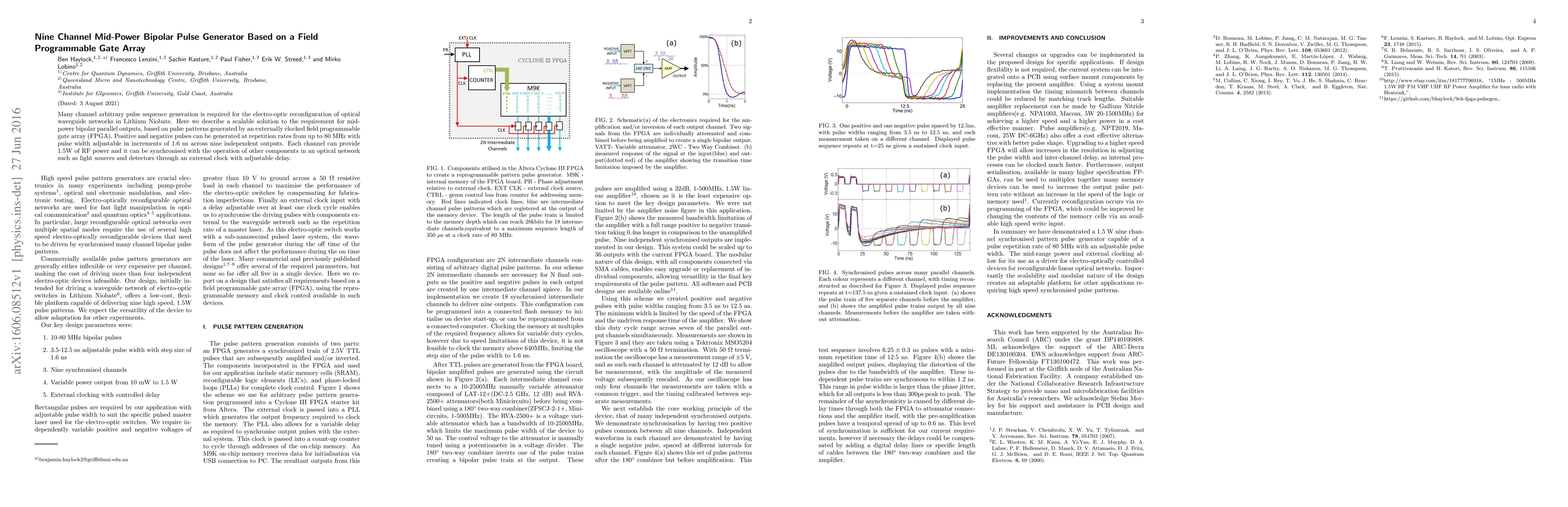 Many channel arbitrary pulse sequence generation is required for the electro-optic reconfiguration of optical waveguide networks in Lithium Niobate. Here we describe a scalable solution to the requirement for mid-power bipolar parallel outputs, based on pulse patterns generated by an externally clocked field programmable gate array (FPGA). Positive and negative pulses can be generated at repetition rates from up to 80~MHz with pulse width adjustable in increments of 1.6~ns across nine independent outputs. Each channel can provide 1.5W of RF power and it can be synchronised with the operation of other components in an optical network such as light sources and detectors through an external clock with adjustable delay.