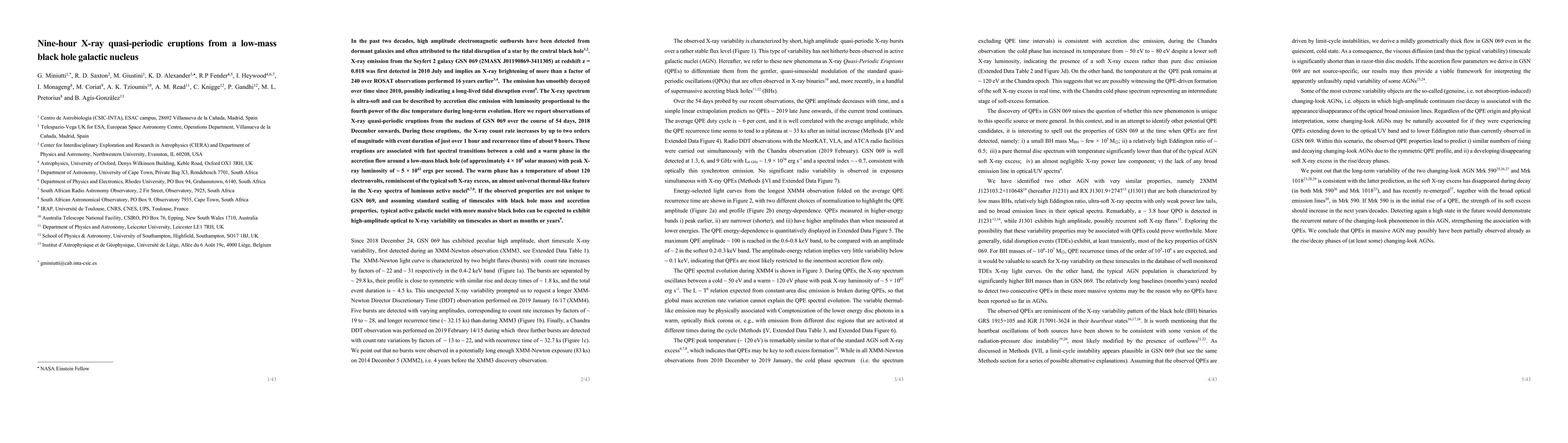 This paper reports on nine-hour quasi-periodic X-ray eruptions from the low-mass black hole in the nucleus of the Seyfert 2 galaxy GSN 069, characterized by rapid spectral transitions between cold and warm phases. These eruptions suggest that similar high-amplitude variability may occur in more massive active galactic nuclei on longer timescales.