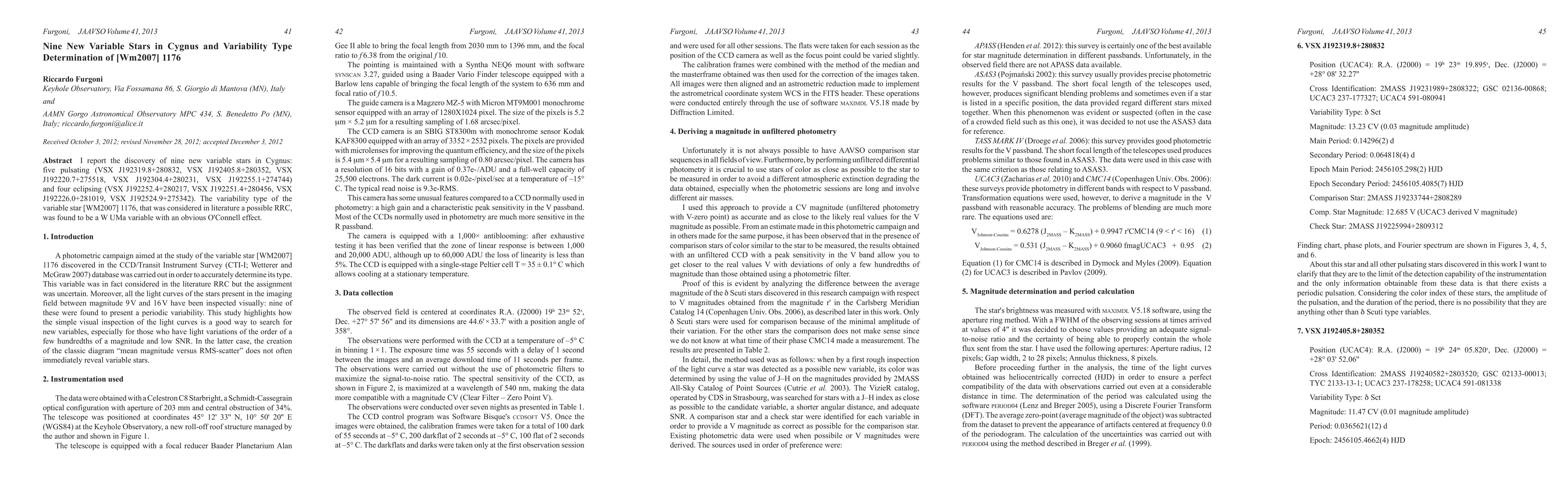 I report the discovery of nine new variable stars in Cygnus: five pulsating (VSX J192319.8+280832, VSX J192405.8+280352, VSX J192220.7+275518, VSX J192304.4+280231, VSX J192255.1+274744) and four eclipsing (VSX J192252.4+280217, VSX J192251.4+280456, VSX J192226.0+281019, VSX J192524.9+275342). The variability type of the variable star [WM2007] 1176, that was considered in literature a possible RRC, was found to be a W UMa variable with an obvious O'Connell effect.