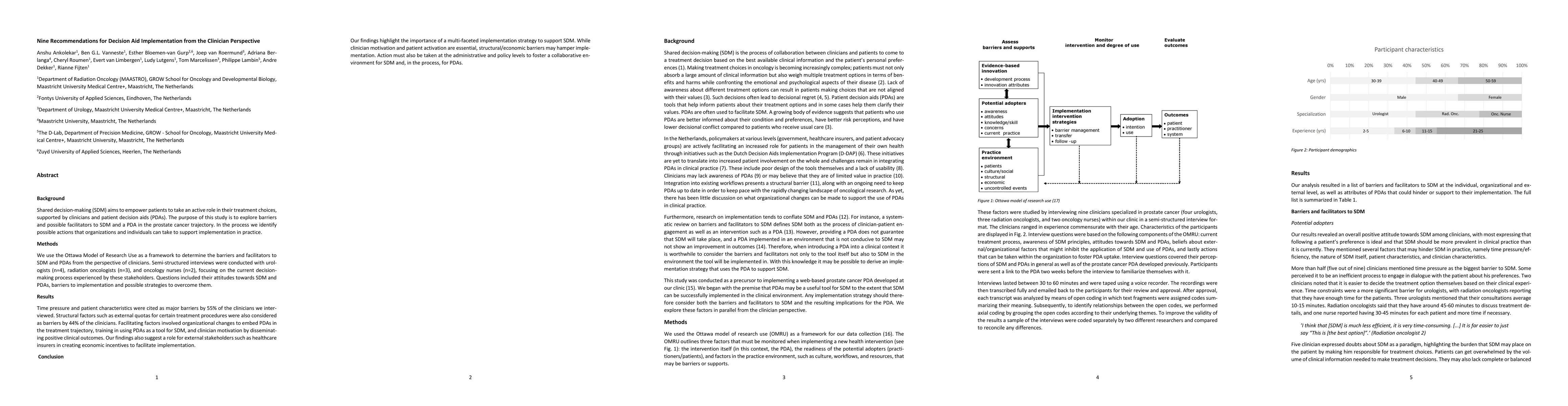 Background: Shared decision-making (SDM) aims to empower patients to take an active role in their treatment choices, supported by clinicians and patient decision aids (PDAs). The purpose of this study is to explore barriers and possible facilitators to SDM and a PDA in the prostate cancer trajectory. In the process we identify possible actions that organizations and individuals can take to support implementation in practice. Methods: We use the Ottawa Model of Research Use as a framework to determine the barriers and facilitators to SDM and PDAs from the perspective of clinicians. Semi-structured interviews were conducted with urologists (n=4), radiation oncologists (n=3), and oncology nurses (n=2), focusing on the current decision-making process experienced by these stakeholders. Questions included their attitudes towards SDM and PDAs, barriers to implementation and possible strategies to overcome them. Results: Time pressure and patient characteristics were cited as major barriers by 55% of the clinicians we interviewed. Structural factors such as external quotas for certain treatment procedures were also considered as barriers by 44% of the clinicians. Facilitating factors involved organizational changes to em-bed PDAs in the treatment trajectory, training in using PDAs as a tool for SDM, and clinician motivation by disseminating positive clinical outcomes. Our findings also suggest a role for external stakeholders such as healthcare insurers in creating economic incentives to facilitate implementation. Conclusion: Our findings highlight the importance of a multi-faceted implementation strategy to support SDM. While clinician motivation and patient activation are essential, structural/economic barriers may hamper implementation. Action must also be taken at the administrative and policy levels to foster a collaborative environment for SDM and, in the process, for PDAs.