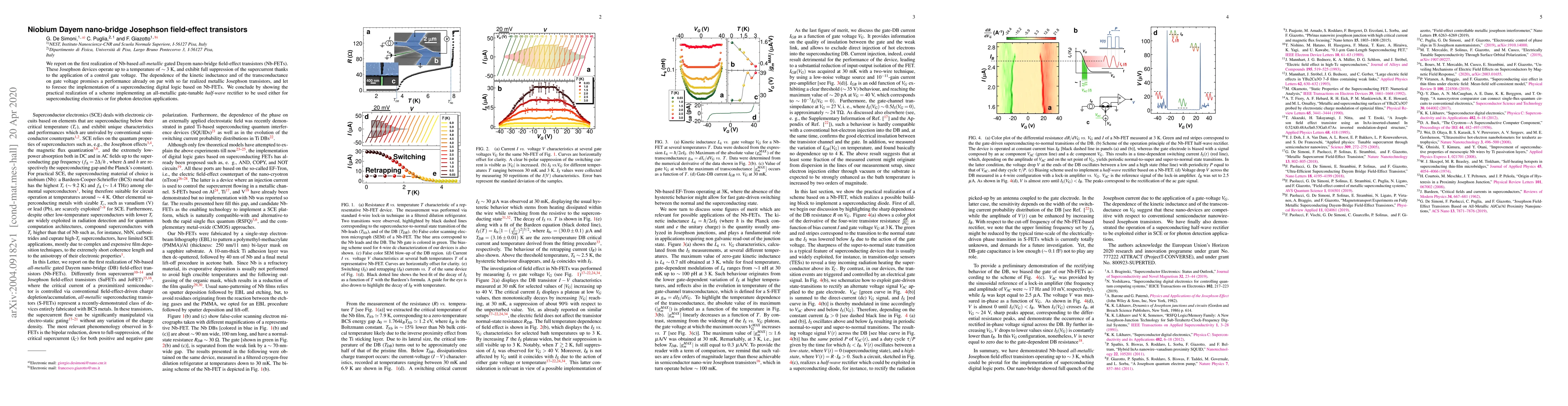 We report on the first realization of Nb-based \textit{all-metallic} gated Dayem nano-bridge field-effect transistors (Nb-FETs). These Josephson devices operate up to a temperature of $\sim 3$ K, and exhibit full suppression of the supercurrent thanks to the application of a control gate voltage. The dependence of the kinetic inductance and of the transconductance on gate voltage promises a performance already on par with so far realized metallic Josephson transistors, and let to foresee the implementation of a superconducting digital logic based on Nb-FETs. We conclude by showing the practical realization of a scheme implementing an all-metallic gate-tunable \emph{half-wave} rectifier to be used either for superconducting electronics or for photon detection applications.