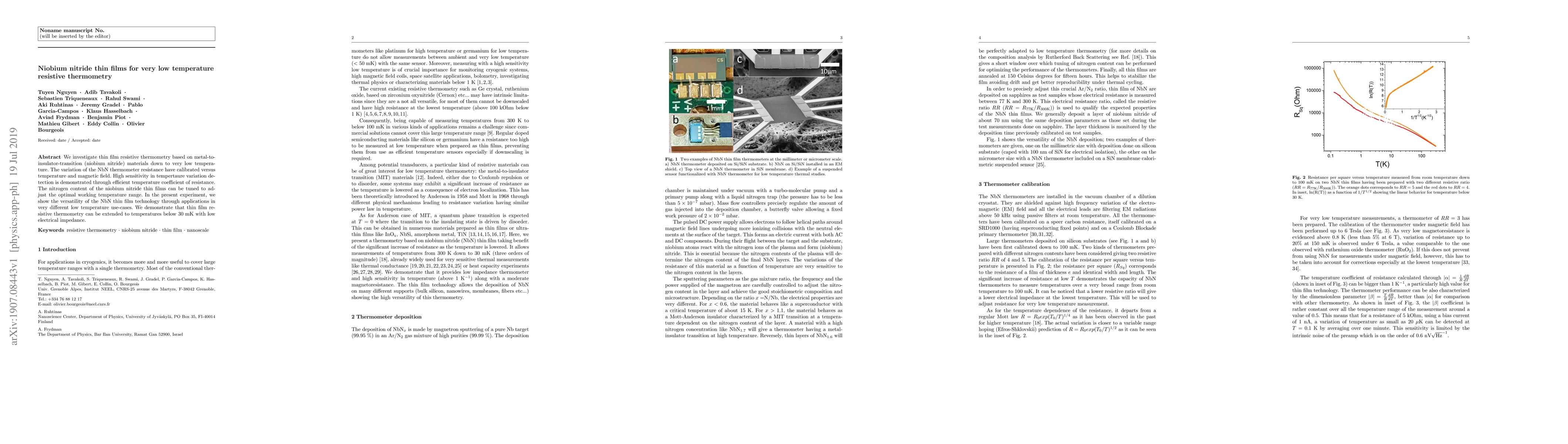 We investigate thin film resistive thermometry based on metal-to-insulator-transition (niobium nitride) materials down to very low temperature. The variation of the NbN thermometer resistance have been calibrated versus temperature and magnetic field. High sensitivity in tempertaure variation detection is demonstrated through efficient temperature coefficient of resistance. The nitrogen content of the niobium nitride thin films can be tuned to adjust the optimal working temperature range. In the present experiment, we show the versatility of the NbN thin film technology through applications in very different low temperature use-cases. We demonstrate that thin film resistive thermometry can be extended to temperatures below 30 mK with low electrical impedance.