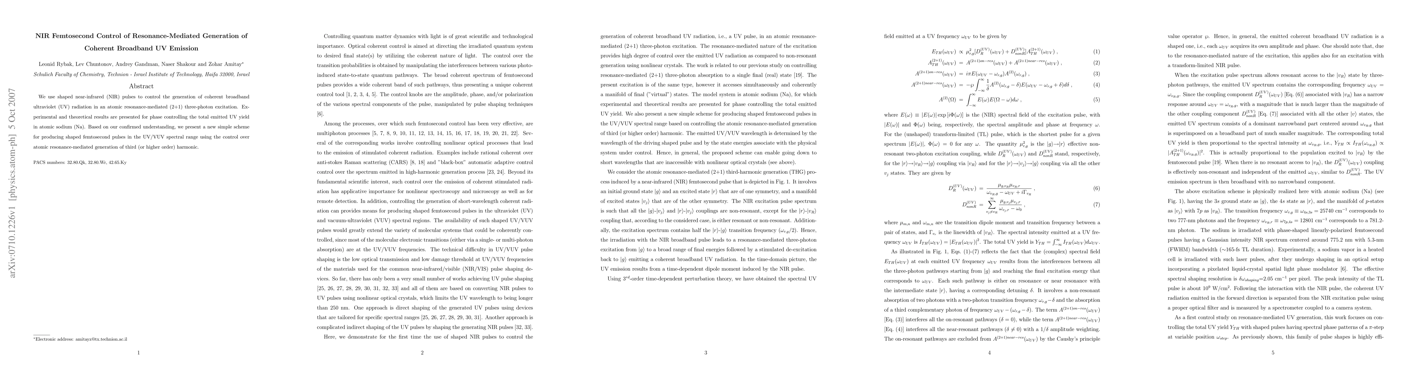 This paper demonstrates the use of shaped near-infrared pulses to control the generation of coherent broadband ultraviolet radiation via atomic resonance-mediated three-photon excitation in sodium atoms. The study presents both experimental and theoretical results showing how phase control can optimize the emitted UV yield, proposing a new method for producing shaped femtosecond pulses in the UV/VUV range.