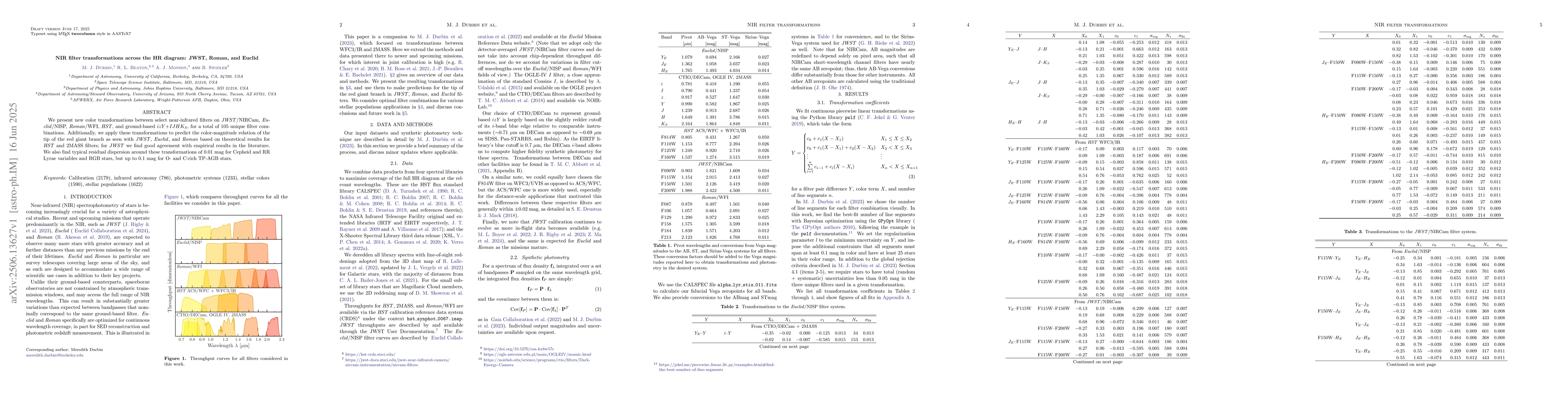 We present new color transformations between select near-infrared filters on JWST/NIRCam, Euclid/NISP, Roman/WFI, HST, and ground-based $izY+IJHK_S$, for a total of 105 unique filter combinations. Additionally, we apply these transformations to predict the color-magnitude relation of the tip of the red giant branch as seen with JWST, Euclid, and Roman based on theoretical results for HST and 2MASS filters; for JWST we find good agreement with empirical results in the literature. We also find typical residual dispersion around these transformations of 0.01 mag for Cepheid and RR Lyrae variables and RGB stars, but up to 0.1 mag for O- and C-rich TP-AGB stars.