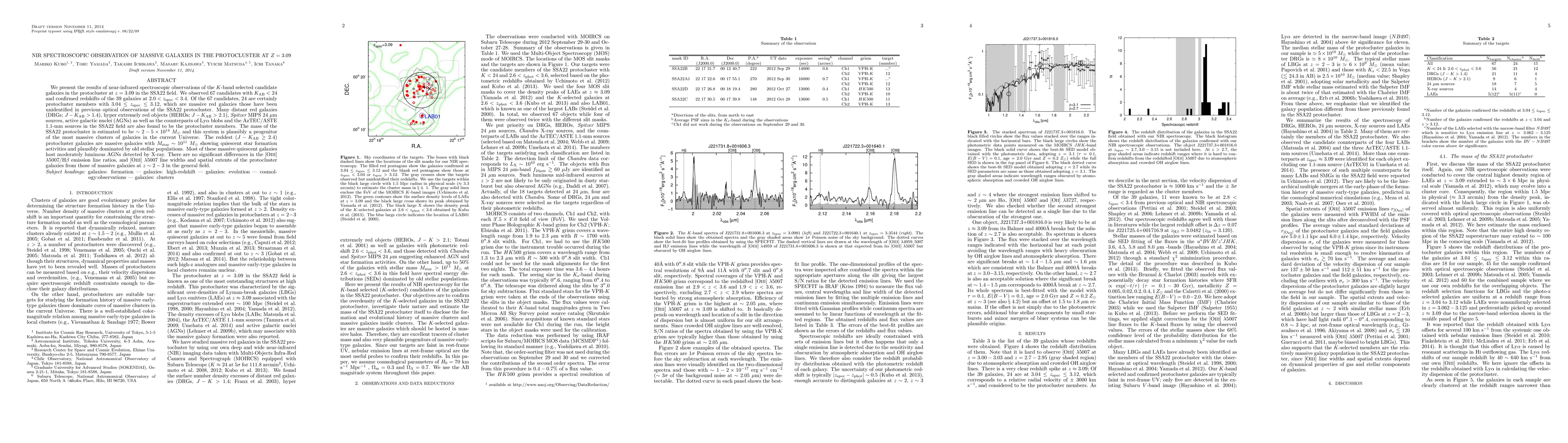 This paper reports near-infrared spectroscopic observations of galaxies in the protocluster at $z=3.09$ in the SSA22 field, identifying 24 massive red galaxies as protocluster members, previously unseen in optical surveys. These galaxies are part of a protocluster with an estimated mass of $\sim2-5\times10^{14}~M_{\odot}$, suggesting it may evolve into a massive galaxy cluster.