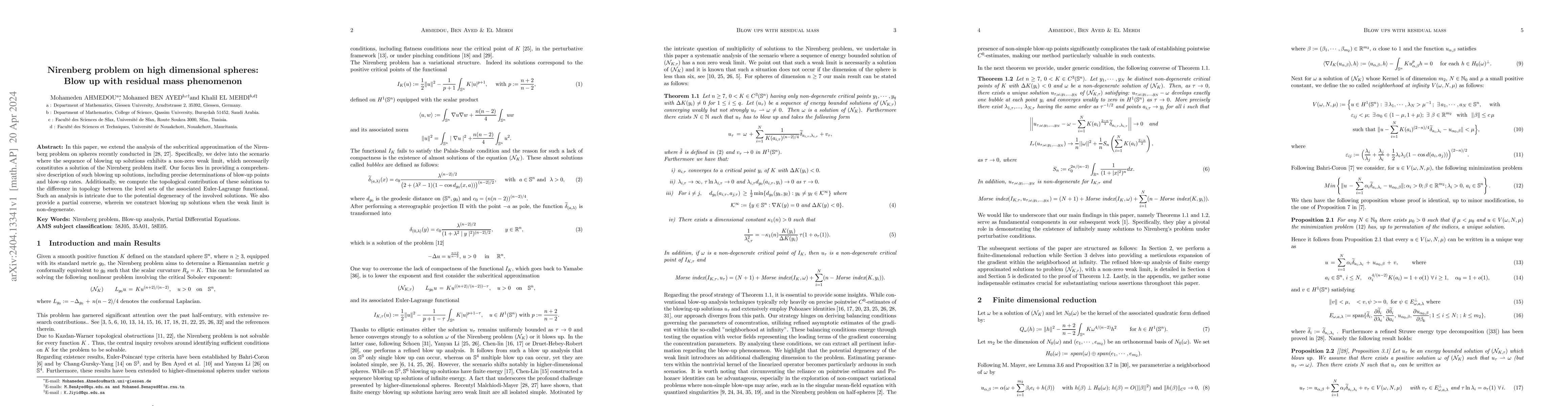 This paper extends the analysis of subcritical approximations to the Nirenberg problem on high-dimensional spheres, focusing on sequences of blow-up solutions with non-zero weak limits that solve the Nirenberg problem. It details the precise blow-up points, rates, and topological contributions, alongside a partial converse construction of non-degenerate blow-up solutions.