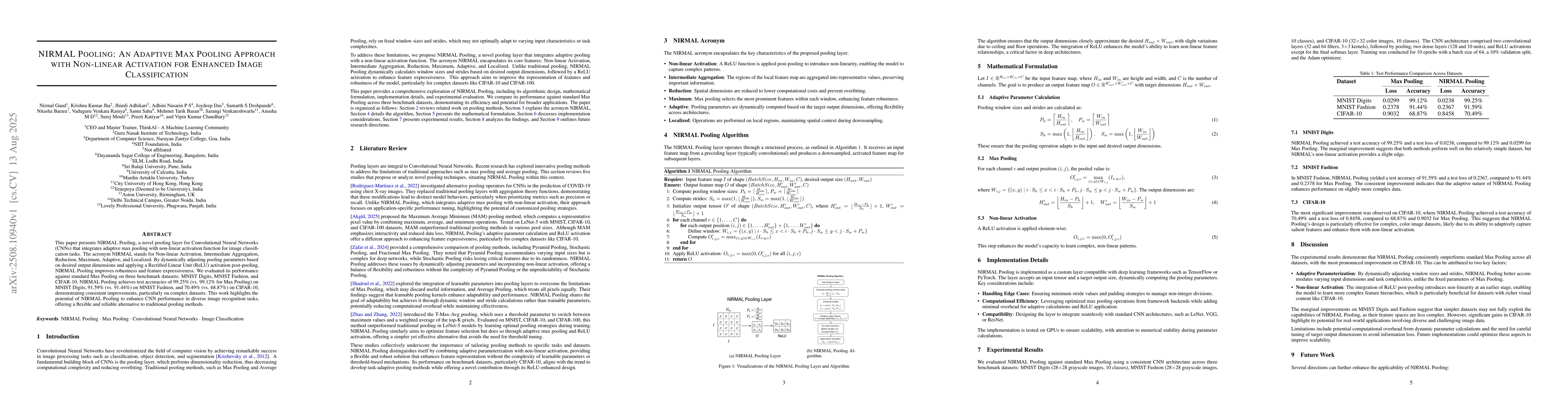 This paper presents NIRMAL Pooling, a novel pooling layer for Convolutional Neural Networks (CNNs) that integrates adaptive max pooling with non-linear activation function for image classification tasks. The acronym NIRMAL stands for Non-linear Activation, Intermediate Aggregation, Reduction, Maximum, Adaptive, and Localized. By dynamically adjusting pooling parameters based on desired output dimensions and applying a Rectified Linear Unit (ReLU) activation post-pooling, NIRMAL Pooling improves robustness and feature expressiveness. We evaluated its performance against standard Max Pooling on three benchmark datasets: MNIST Digits, MNIST Fashion, and CIFAR-10. NIRMAL Pooling achieves test accuracies of 99.25% (vs. 99.12% for Max Pooling) on MNIST Digits, 91.59% (vs. 91.44%) on MNIST Fashion, and 70.49% (vs. 68.87%) on CIFAR-10, demonstrating consistent improvements, particularly on complex datasets. This work highlights the potential of NIRMAL Pooling to enhance CNN performance in diverse image recognition tasks, offering a flexible and reliable alternative to traditional pooling methods.