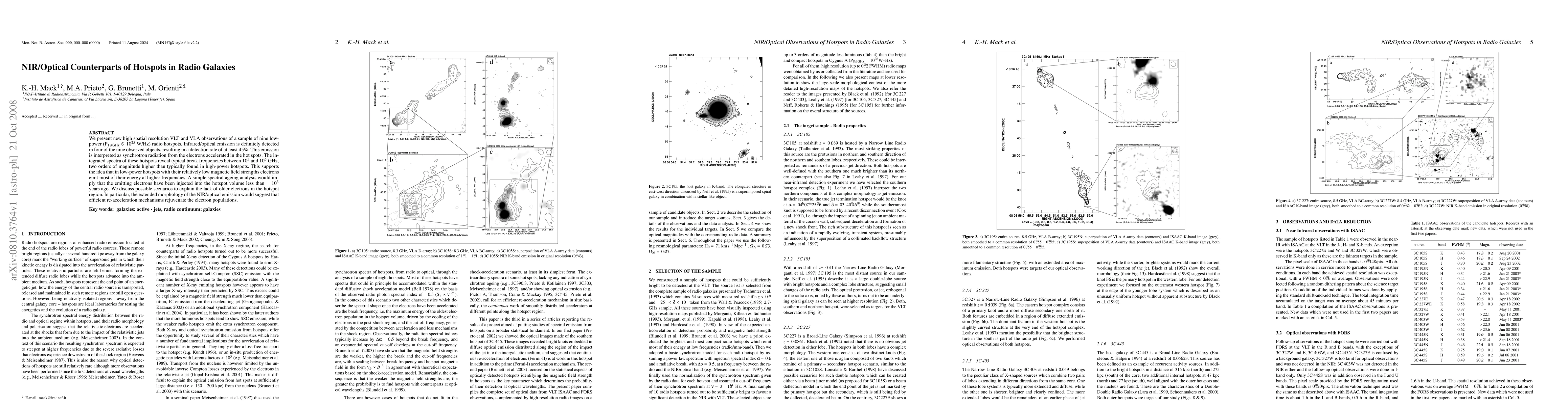 We present new high spatial resolution VLT and VLA observations of a sample of nine low-power (P_{1.4 GHz} < 10^{25} W/Hz) radio hotspots. Infrared/optical emission is definitely detected in four of the nine observed objects, resulting in a detection rate of at least 45%. This emission is interpreted as synchrotron radiation from the electrons accelerated in the hot spots. The integrated spectra of these hotspots reveal typical break frequencies between 10^5 and 10^6 GHz, two orders of magnitude higher than typically found in high-power hotspots. This supports the idea that in low-power hotspots with their relatively low magnetic field strengths electrons emit most of their energy at higher frequencies. A simple spectral ageing analysis would imply that the emitting electrons have been injected into the hotspot volume less than ~10^3 years ago. We discuss possible scenarios to explain the lack of older electrons in the hotspot region. In particular, the extended morphology of the NIR/optical emission would suggest that efficient re-acceleration mechanisms rejuvenate the electron populations.
