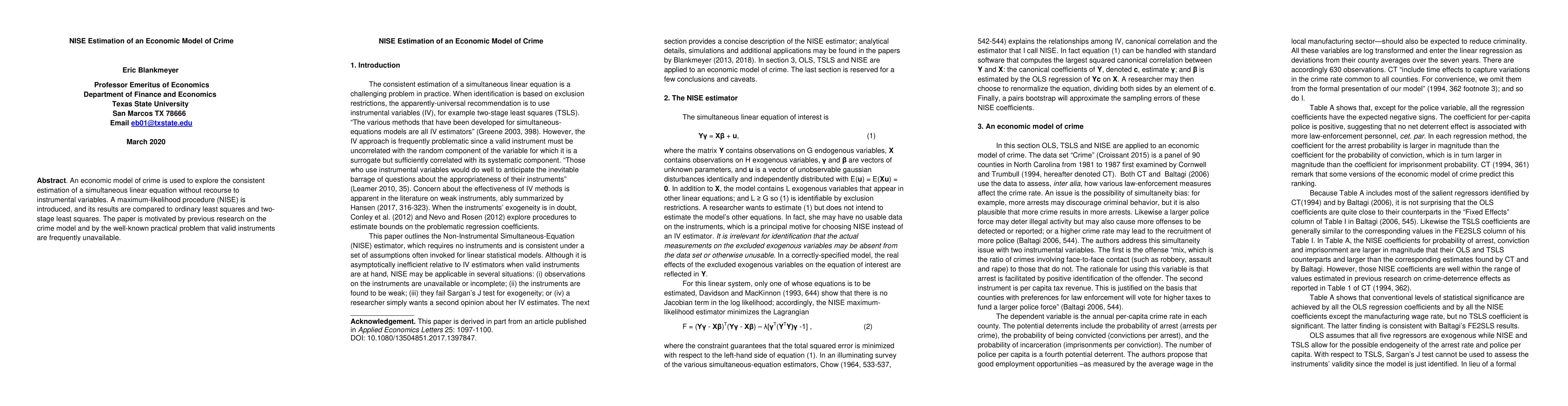 This paper introduces a new maximum-likelihood procedure called NISE for consistently estimating a simultaneous linear equation in an economic model of crime without using instrumental variables. The results of NISE are compared to ordinary least squares and two-stage least squares, addressing the common issue of unavailable valid instruments.