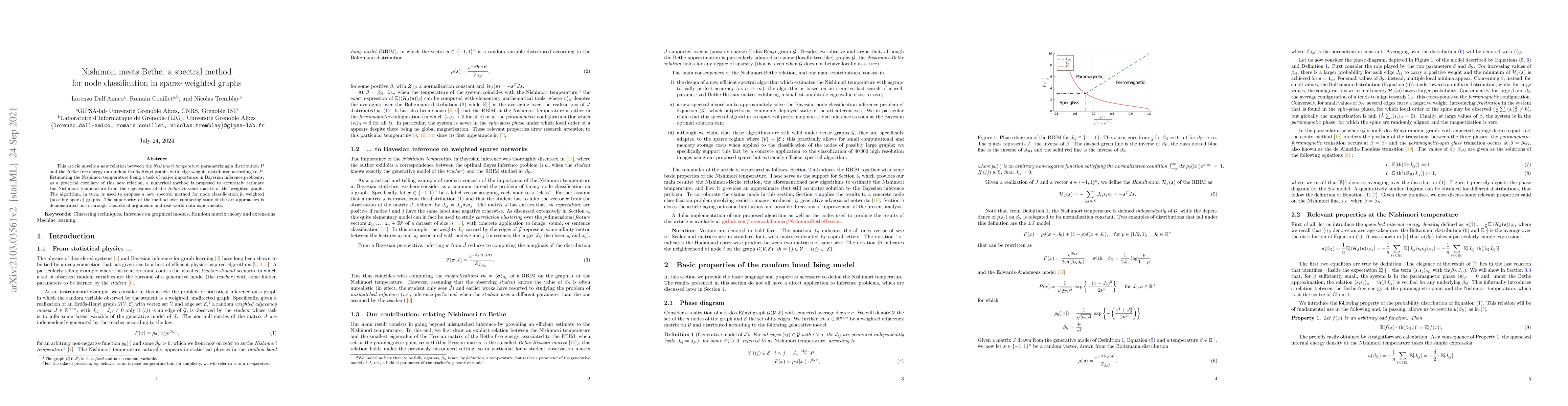 This article unveils a new relation between the Nishimori temperature parametrizing a distribution P and the Bethe free energy on random Erdos-Renyi graphs with edge weights distributed according to P. Estimating the Nishimori temperature being a task of major importance in Bayesian inference problems, as a practical corollary of this new relation, a numerical method is proposed to accurately estimate the Nishimori temperature from the eigenvalues of the Bethe Hessian matrix of the weighted graph. The algorithm, in turn, is used to propose a new spectral method for node classification in weighted (possibly sparse) graphs. The superiority of the method over competing state-of-the-art approaches is demonstrated both through theoretical arguments and real-world data experiments.