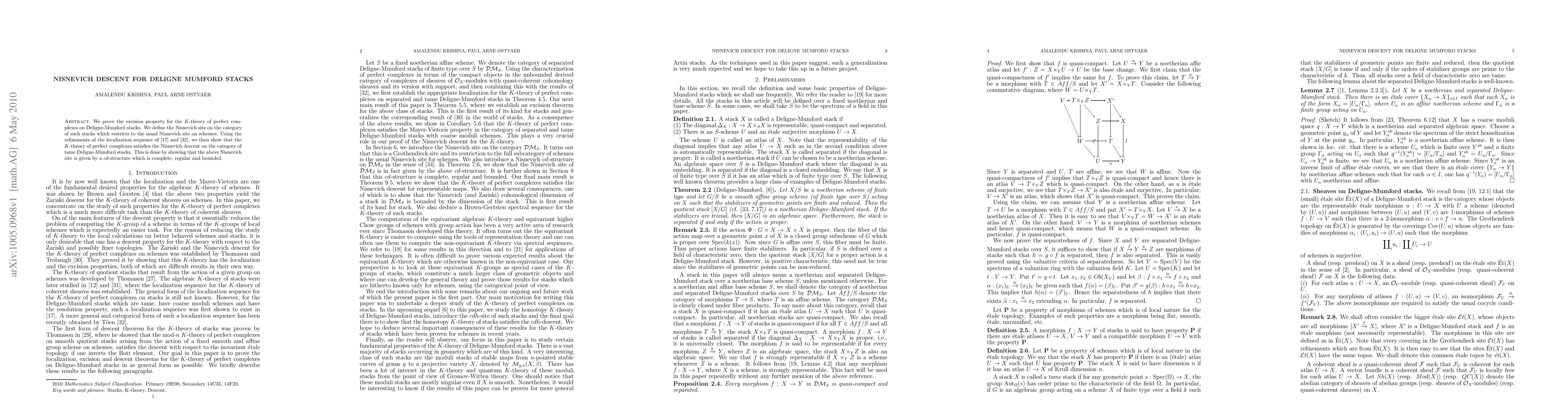 This paper proves the excision theorem for $K$-theory of perfect complexes on Deligne-Mumford stacks, establishing Nisnevich descent for this $K$-theory and exploring its implications for the Nisnevich site of such stacks.
