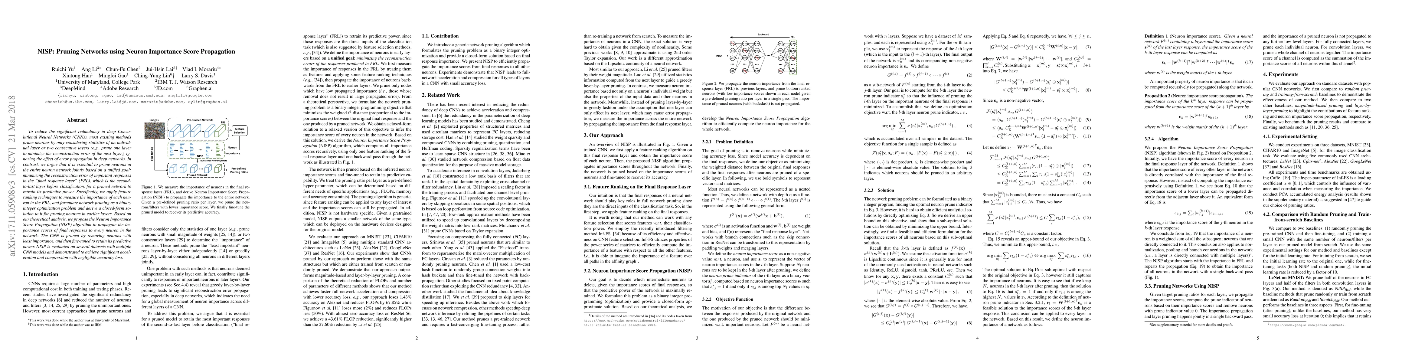 The NISP algorithm prunes neurons in deep CNNs by propagating importance scores from the final response layer to earlier layers, aiming to minimize reconstruction error and maintain predictive power. Evaluated on various datasets, NISP achieves notable compression and speedup with minimal loss in accuracy.
