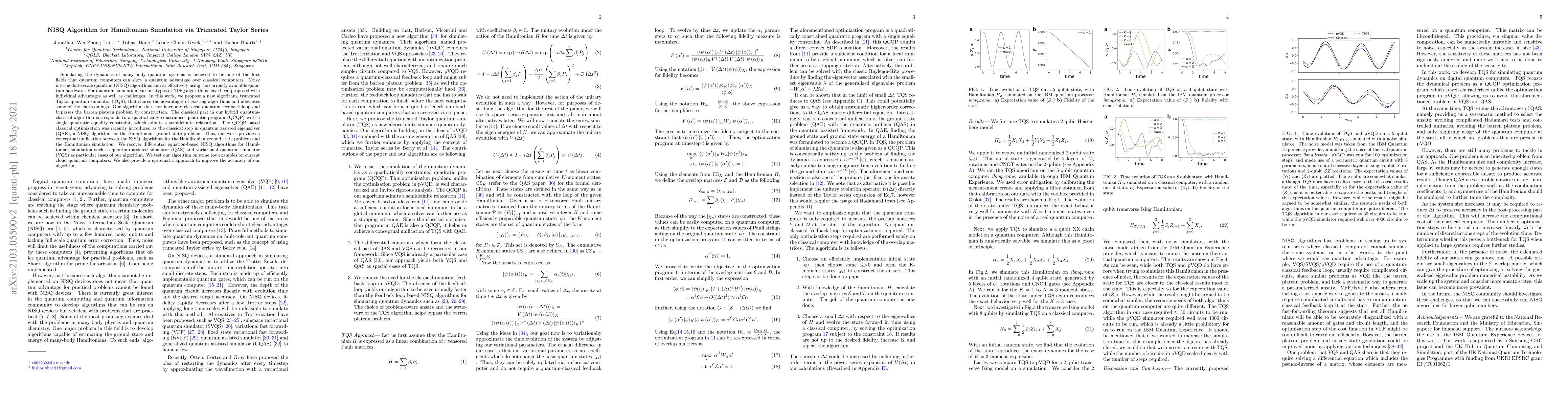 The paper proposes a new algorithm, Truncated Taylor Quantum Simulator (TTQS), for Hamiltonian simulation on NISQ devices. It utilizes a hybrid quantum-classical approach, avoiding classical-quantum feedback loops and bypassing the barren plateau problem. The algorithm is formulated as a Quadratically Constrained Quadratic Program (QCQP) with a single quadratic equality constraint, solvable via semidefinite relaxation.