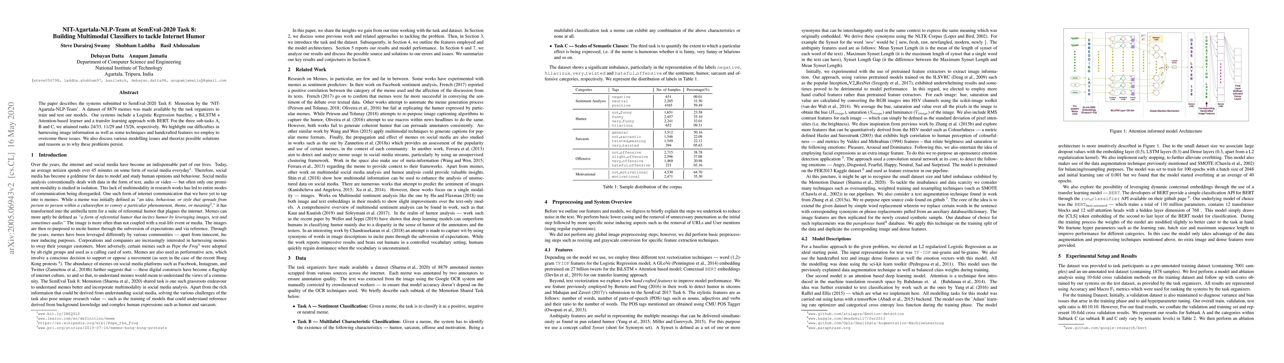The paper describes the systems submitted to SemEval-2020 Task 8: Memotion by the `NIT-Agartala-NLP-Team'. A dataset of 8879 memes was made available by the task organizers to train and test our models. Our systems include a Logistic Regression baseline, a BiLSTM + Attention-based learner and a transfer learning approach with BERT. For the three sub-tasks A, B and C, we attained ranks 24/33, 11/29 and 15/26, respectively. We highlight our difficulties in harnessing image information as well as some techniques and handcrafted features we employ to overcome these issues. We also discuss various modelling issues and theorize possible solutions and reasons as to why these problems persist.