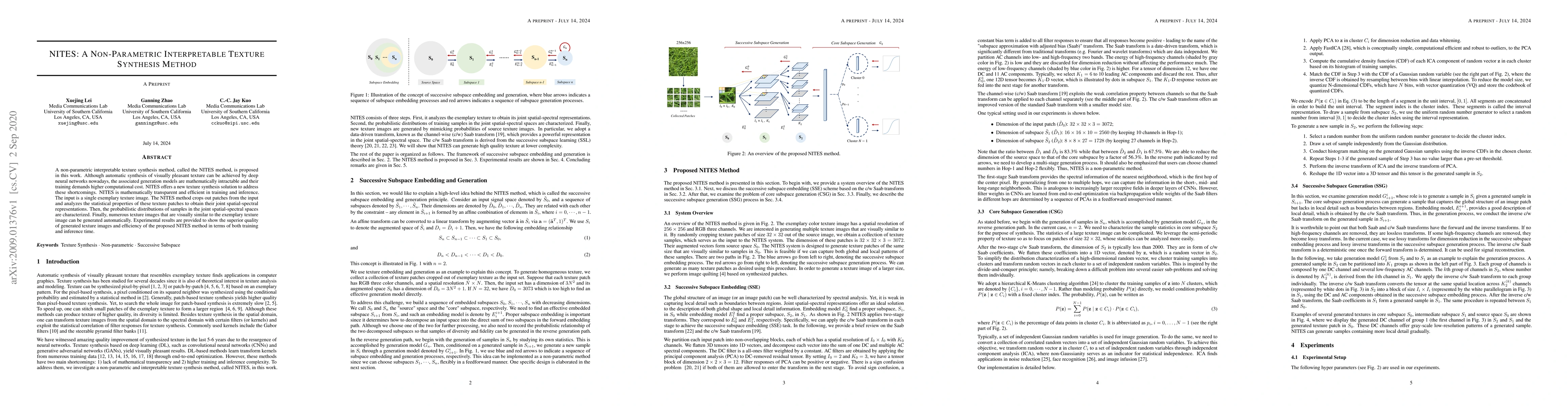 The NITES method presents a non-parametric, interpretable approach for texture synthesis that is mathematically transparent and efficient. It generates visually similar textures by analyzing statistical properties of texture patches and characterizing their probabilistic distributions, offering a cost-effective alternative to deep neural networks.