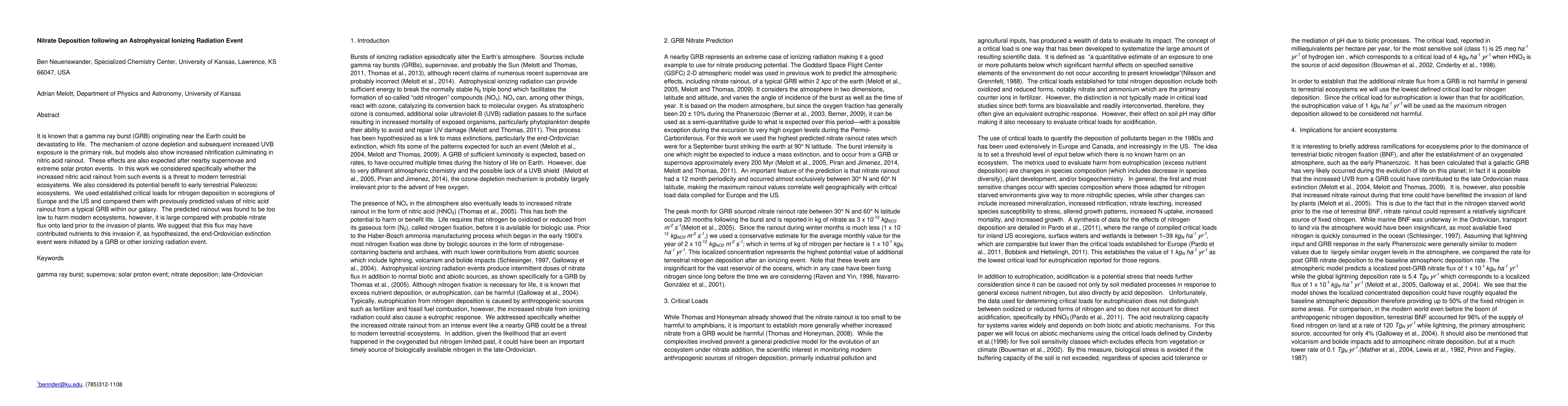This paper examines the potential ecological impacts of increased nitric acid rainout from astrophysical events like gamma ray bursts, finding it insufficient to harm modern ecosystems but suggesting it could have benefited early Paleozoic ecosystems during the transition to land-based life.
