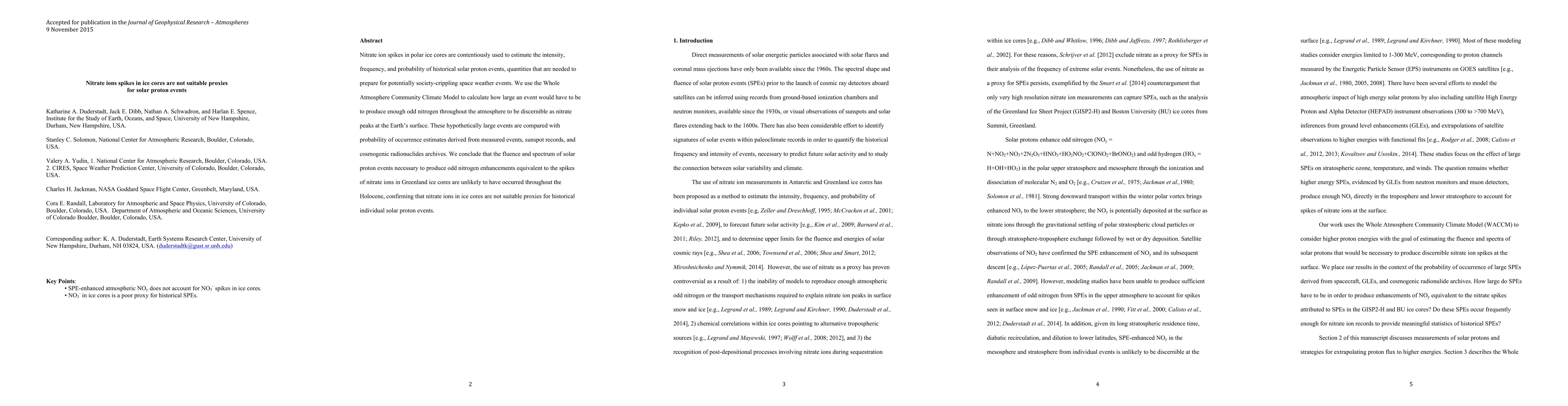 This study finds that nitrate ion spikes in ice cores are unreliable proxies for historical solar proton events, as the necessary fluence and spectrum of these events are unlikely to have occurred based on model simulations and historical data. Therefore, these spikes cannot accurately represent the intensity and frequency of past solar proton events.