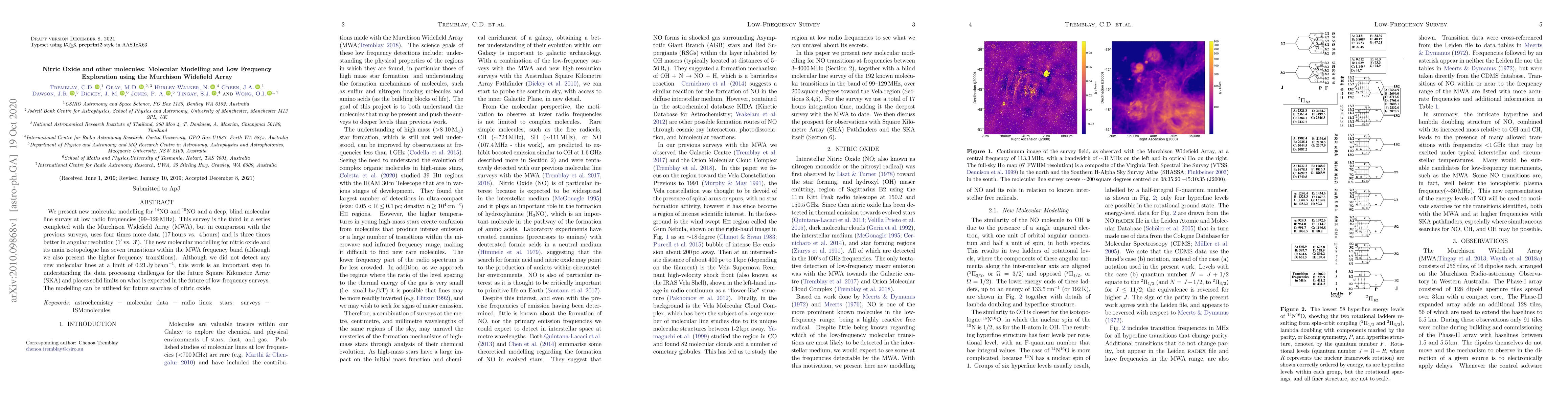 We present new molecular modelling for 14NO and 15NO and a deep, blind molecular line survey at low radio frequencies (99-129 MHz). This survey is the third in a series completed with the Murchison Widefield Array (MWA), but in comparison with the previous surveys, uses four times more data (17 hours vs. 4 hours) and is three times better in angular resolution (1' vs. 3'). The new molecular modelling for nitric oxide and its main isotopologue has seven transitions within the MWA frequency band (although we also present the higher frequency transitions). Although we did not detect any new molecular lines at a limit of 0.21 Jy beam^-1, this work is an important step in understanding the data processing challenges for the future Square Kilometre Array (SKA) and places solid limits on what is expected in the future of low-frequency surveys. The modelling can be utilised for future searches of nitric oxide.