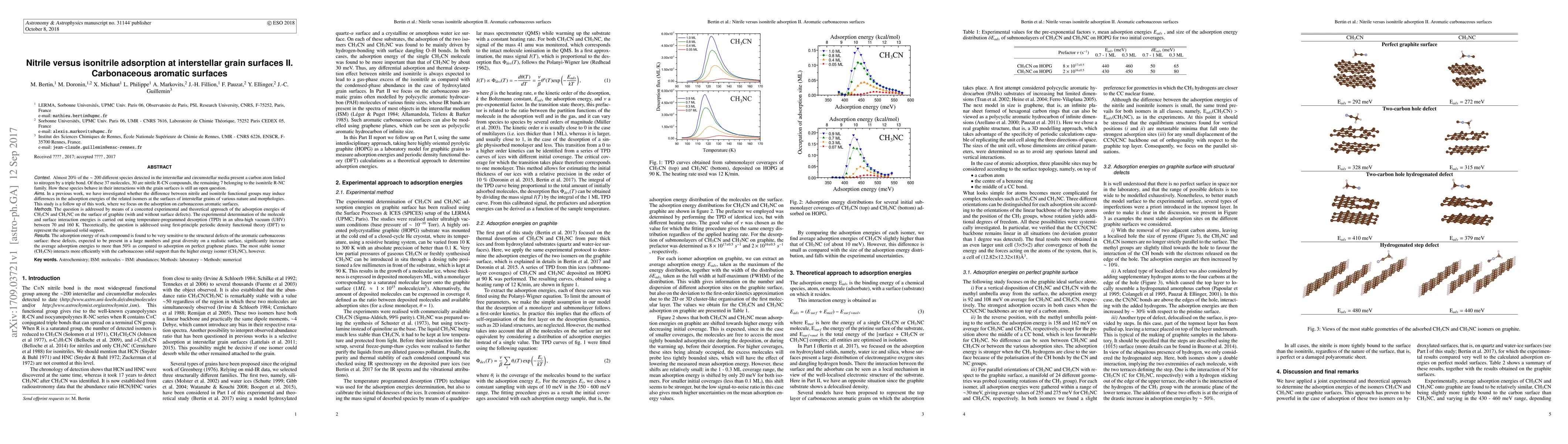 Almost 20 % of the ~ 200 different species detected in the interstellar and circumstellar media present a carbon atom linked to nitrogen by a triple bond. Of these 37 molecules, 30 are nitrile R-CN compounds, the remaining 7 belonging to the isonitrile R-NC family. How these species behave in their interactions with the grain surfaces is still an open question. In a previous work, we have investigated whether the difference between nitrile and isonitrile functional groups may induce differences in the adsorption energies of the related isomers at the surfaces of interstellar grains of various nature and morphologies. This study is a follow up of this work, where we focus on the adsorption on carbonaceous aromatic surfaces. The question is addressed by means of a concerted experimental and theoretical approach of the adsorption energies of CH$_3$CN and CH$_3$NC on the surface of graphite (with and without surface defects). The experimental determination of the molecule and surface interaction energies is carried out using temperature-programmed desorption (TPD) in an ultra-high vacuum (UHV) between 70 and 160 K. Theoretically, the question is addressed using first-principle periodic density functional theory (DFT) to represent the organised solid support. The adsorption energy of each compound is found to be very sensitive to the structural defects of the aromatic carbonaceous surface: these defects, expected to be present in a large numbers and great diversity on a realistic surface, significantly increase the average adsorption energies to more than 50\% as compared to adsorption on perfect graphene planes. The most stable isomer (CH$_3$CN) interacts more efficiently with the carbonaceous solid support than the higher energy isomer (CH$_3$NC), however.