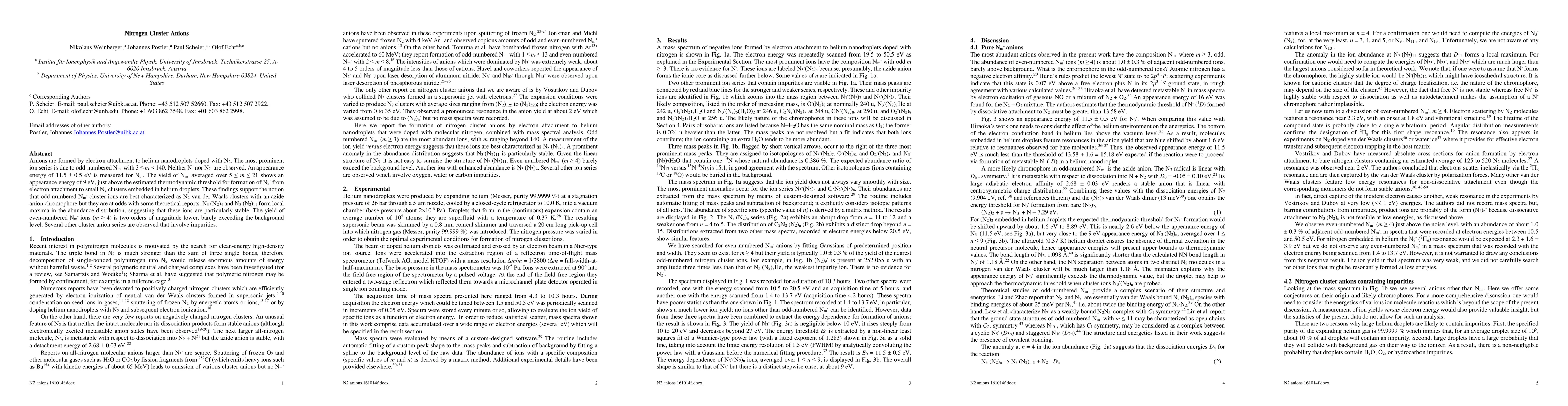 Anions are formed by electron attachment to helium nanodroplets doped with N$_2$. The most prominent ion series is due to odd-numbered N$_m$$^{-}$ with 3 $\le$ m < 140. Neither N$^{-}$ nor N$_2$$^{-}$ are observed. An appearance energy of 11.5 $\pm$ 0.5 eV is measured for N$_3$$^{-}$. The yield of N$_m$$^{-}$ averaged over 5 $\le$ m $\le$ 21 shows an appearance energy of 9 eV, just above the estimated thermodynamic threshold for formation of N$_3$$^{-}$ from electron attachment to small N$_2$ clusters embedded in helium droplets. These findings support the notion that odd-numbered N$_m$$^{-}$ cluster ions are best characterized as N$_2$ van der Waals clusters with an azide anion chromophore but they are at odds with some theoretical reports. N$_3$$^{-}$(N$_2$)$_4$ and N$_3$$^{-}$(N$_2$)$_{11}$ form local maxima in the abundance distribution, suggesting that these ions are particularly stable. The yield of even-numbered N$_m$$^{-}$ ions (m $\ge$ 4) is two orders of magnitude lower, barely exceeding the background level. Several other cluster anion series are observed that involve impurities.