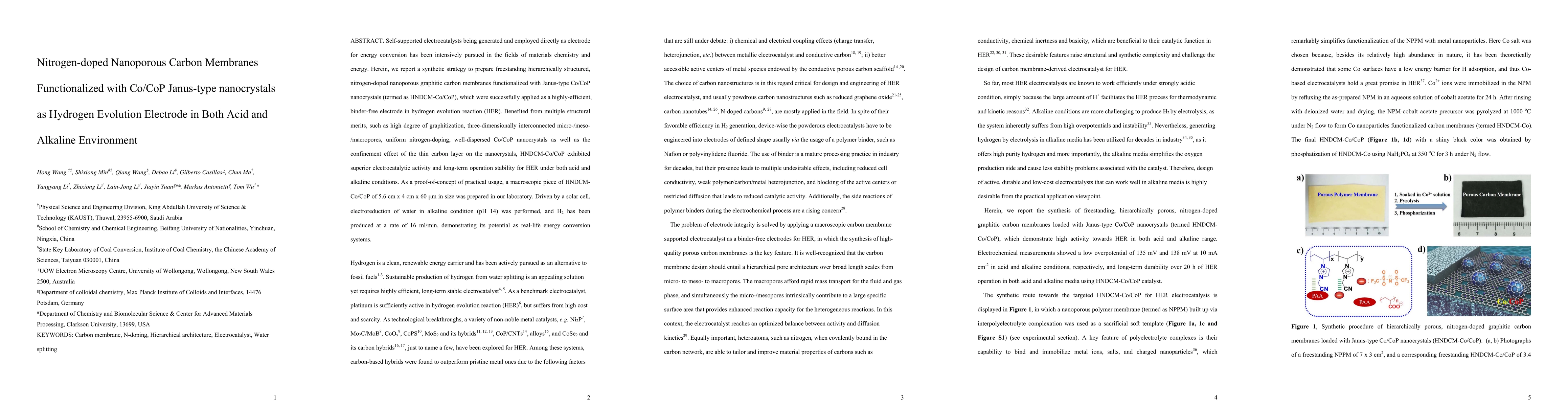 Self-supported electrocatalysts being generated and employed directly as electrode for energy conversion has been intensively pursued in the fields of materials chemistry and energy. Herein, we report a synthetic strategy to prepare freestanding hierarchically structured, nitrogen-doped nanoporous graphitic carbon membranes functionalized with Janus-type Co/CoP nanocrystals (termed as HNDCM-Co/CoP), which were successfully applied as a highly-efficient, binder-free electrode in hydrogen evolution reaction (HER). Benefited from multiple structural merits, such as high degree of graphitization, three-dimensionally interconnected micro-/meso-/macropores, uniform nitrogen-doping, well-dispersed Co/CoP nanocrystals as well as the confinement effect of the thin carbon layer on the nanocrystals, HNDCM-Co/CoP exhibited superior electrocatalytic activity and long-term operation stability for HER under both acid and alkaline conditions. As a proof-of-concept of practical usage, a macroscopic piece of HNDCM-Co/CoP of 5.6 cm x 4 cm x 60 um in size was prepared in our laboratory. Driven by a solar cell, electroreduction of water in alkaline condition (pH 14) was performed, and H2 has been produced at a rate of 16 ml/min, demonstrating its potential as real-life energy conversion systems.