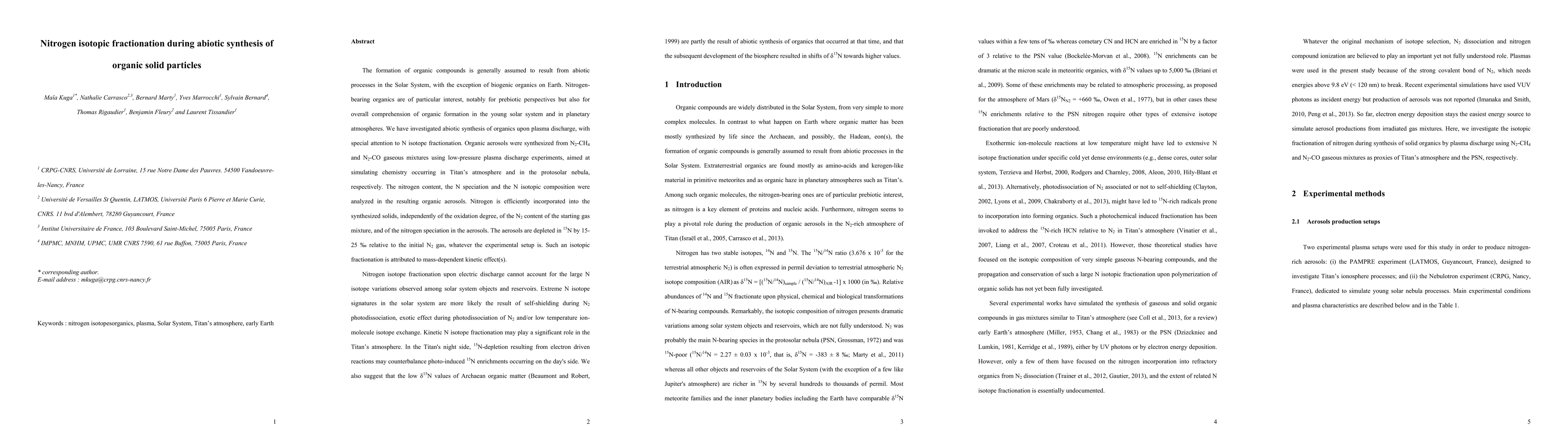 This study investigates nitrogen isotopic fractionation during abiotic synthesis of organic aerosols via plasma discharge, revealing consistent depletion in 15N by 15-25 permil. The findings suggest that kinetic effects, rather than electric discharge, are responsible for significant nitrogen isotope variations in the solar system.