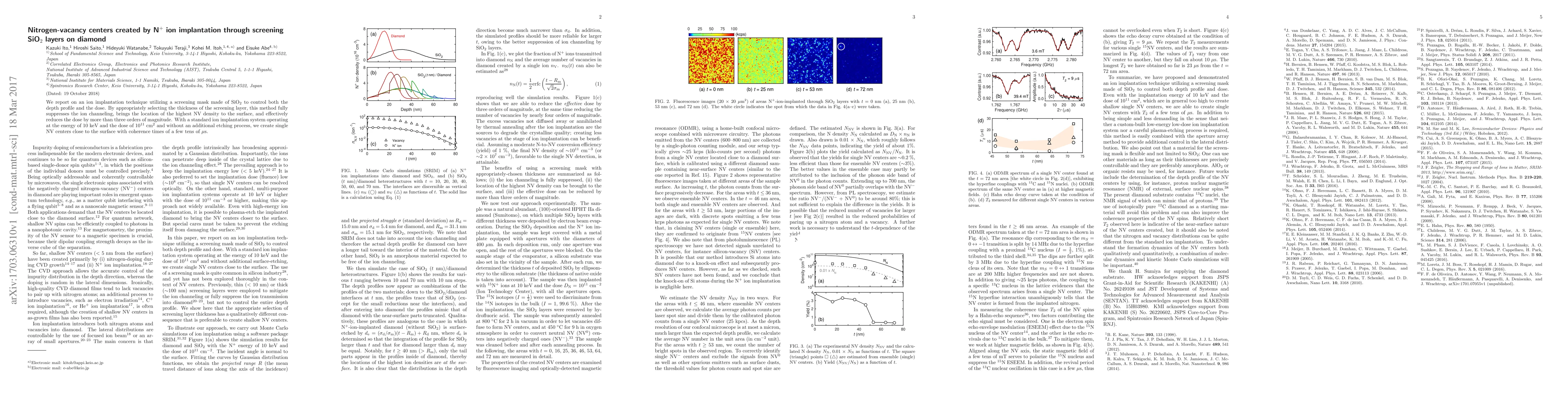 This paper describes a novel ion implantation technique using a SiO$_2$ screening mask to create nitrogen-vacancy (NV) centers in diamond. The method effectively suppresses ion channeling, maximizes NV density near the surface, and reduces the implantation dose by over three orders of magnitude, achieving single NV centers with coherence times of tens of microseconds.