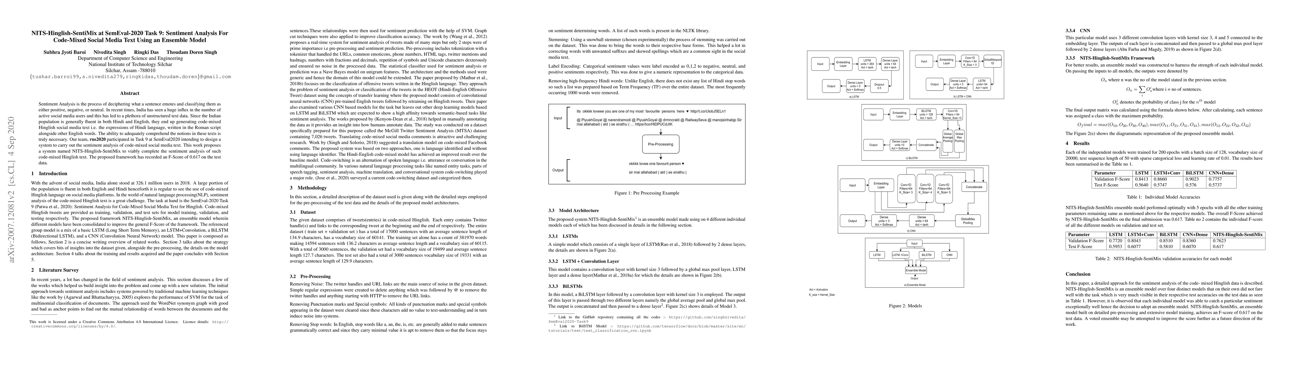 Sentiment Analysis is the process of deciphering what a sentence emotes and classifying them as either positive, negative, or neutral. In recent times, India has seen a huge influx in the number of active social media users and this has led to a plethora of unstructured text data. Since the Indian population is generally fluent in both Hindi and English, they end up generating code-mixed Hinglish social media text i.e. the expressions of Hindi language, written in the Roman script alongside other English words. The ability to adequately comprehend the notions in these texts is truly necessary. Our team, rns2020 participated in Task 9 at SemEval2020 intending to design a system to carry out the sentiment analysis of code-mixed social media text. This work proposes a system named NITS-Hinglish-SentiMix to viably complete the sentiment analysis of such code-mixed Hinglish text. The proposed framework has recorded an F-Score of 0.617 on the test data.