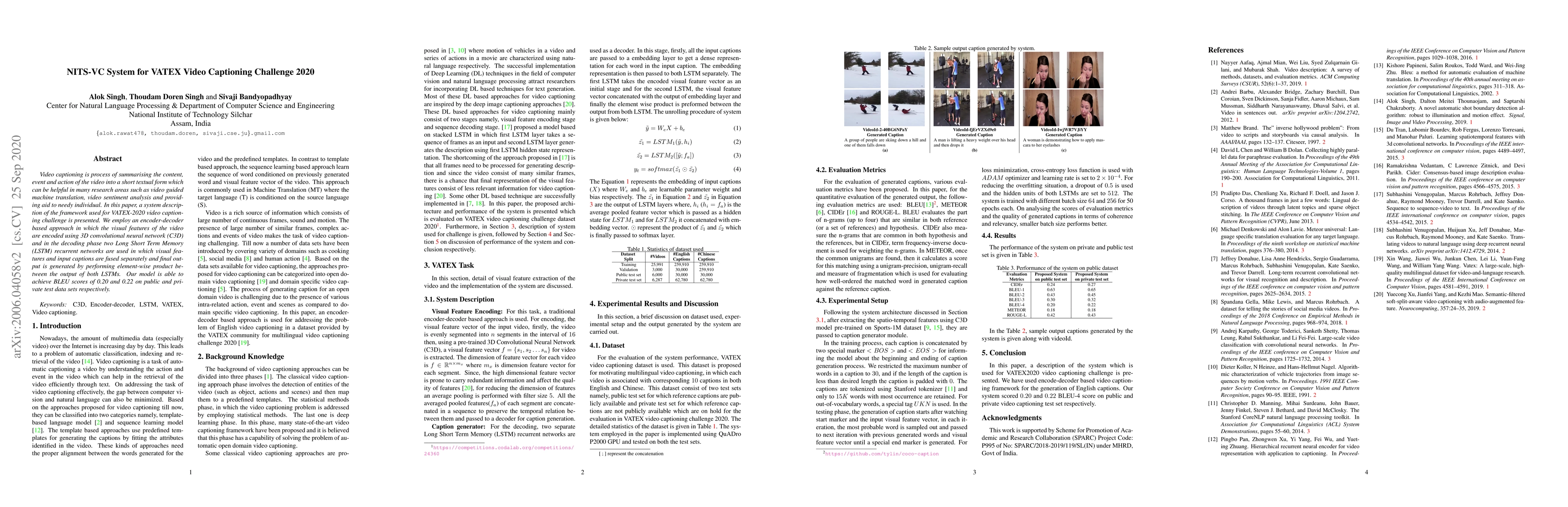 Video captioning is process of summarising the content, event and action of the video into a short textual form which can be helpful in many research areas such as video guided machine translation, video sentiment analysis and providing aid to needy individual. In this paper, a system description of the framework used for VATEX-2020 video captioning challenge is presented. We employ an encoder-decoder based approach in which the visual features of the video are encoded using 3D convolutional neural network (C3D) and in the decoding phase two Long Short Term Memory (LSTM) recurrent networks are used in which visual features and input captions are fused separately and final output is generated by performing element-wise product between the output of both LSTMs. Our model is able to achieve BLEU scores of 0.20 and 0.22 on public and private test data sets respectively.