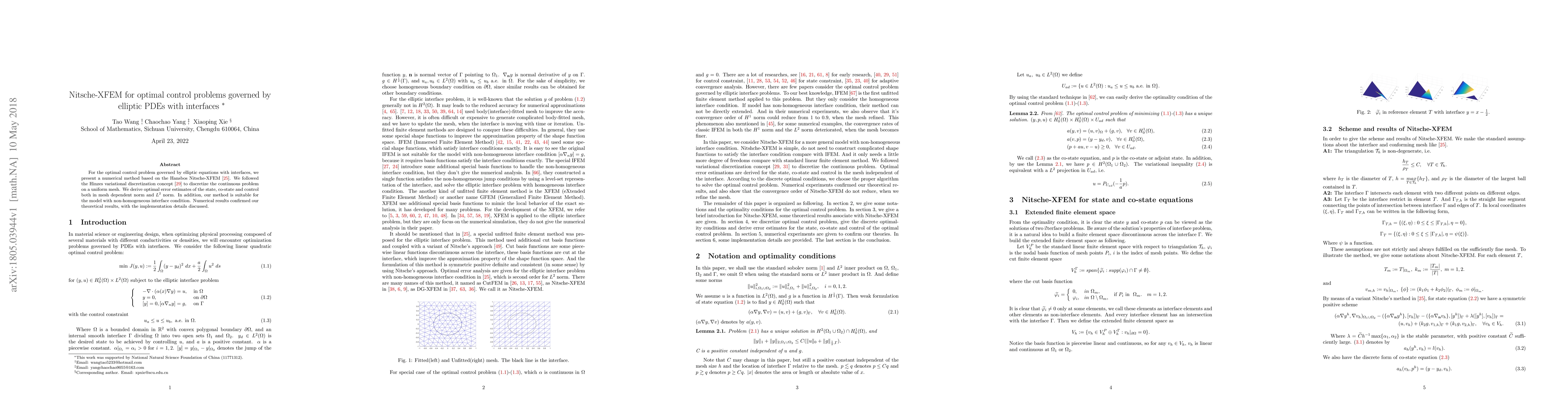 This paper proposes a numerical method based on Hansbo's Nitsche-XFEM for solving optimal control problems governed by elliptic PDEs with interfaces. The method follows Hinze's variational discretization concept and achieves optimal error estimates in both mesh-dependent and L2 norms, suitable for non-homogeneous interface conditions, as confirmed by numerical results.