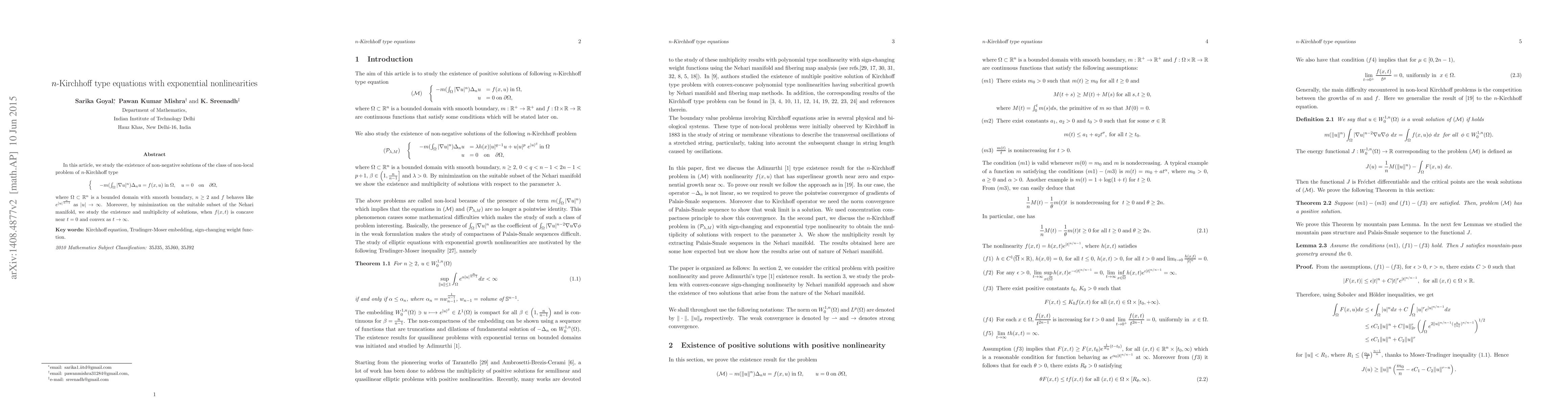 In this article, we study the existence of non-negative solutions of the class of non-local problem of $n$-Kirchhoff type $$ \left\{ \begin{array}{lr} \quad - m(\int_{\Omega}|\nabla u|^n)\Delta_n u = f(x,u) \; \text{in}\; \Omega,\quad u =0\quad\text{on} \quad \partial \Omega, \end{array} \right.$$ where $\Omega\subset \mathbf{R}^n$ is a bounded domain with smooth boundary, $n\geq 2$ and $f$ behaves like $e^{|u|^{\frac{n}{n-1}}}$ as $|u|\to\infty$. Moreover, by minimization on the suitable subset of the Nehari manifold, we study the existence and multiplicity of solutions, when $f(x,t)$ is concave near $t=0$ and convex as $t\rightarrow \infty.$
