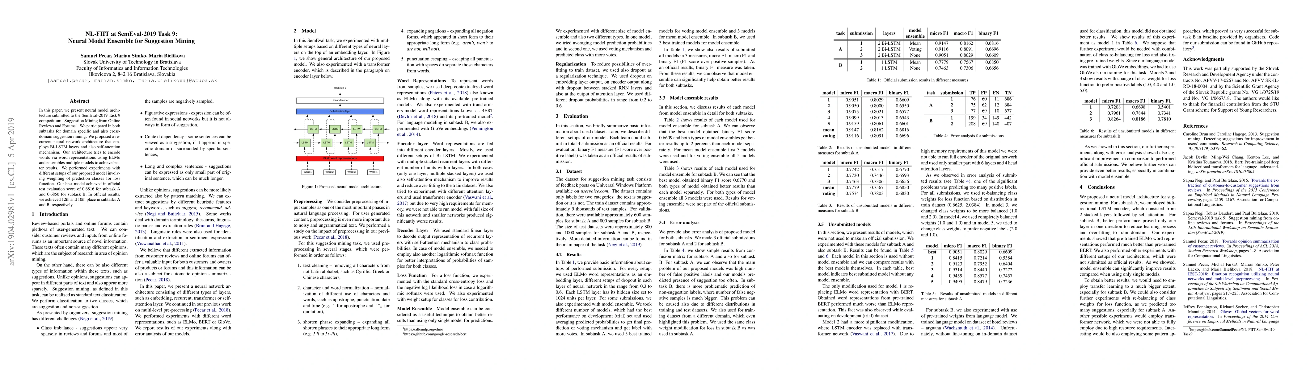 In this paper, we present neural model architecture submitted to the SemEval-2019 Task 9 competition: "Suggestion Mining from Online Reviews and Forums". We participated in both subtasks for domain specific and also cross-domain suggestion mining. We proposed a recurrent neural network architecture that employs Bi-LSTM layers and also self-attention mechanism. Our architecture tries to encode words via word representations using ELMo and ensembles multiple models to achieve better results. We performed experiments with different setups of our proposed model involving weighting of prediction classes for loss function. Our best model achieved in official test evaluation score of 0.6816 for subtask A and 0.6850 for subtask B. In official results, we achieved 12th and 10th place in subtasks A and B, respectively.