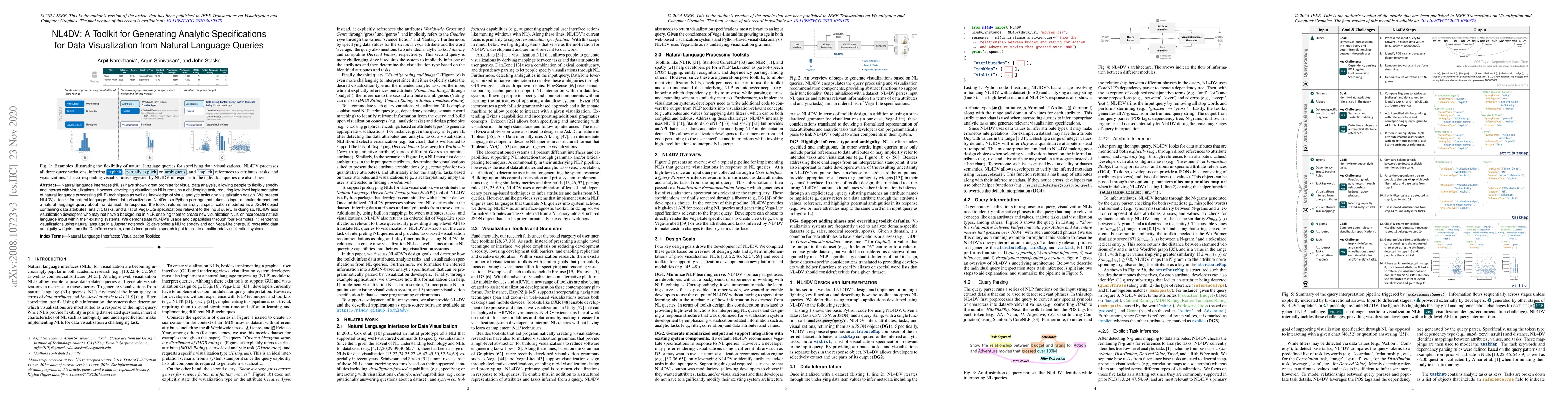 NL4DV is a Python toolkit that translates natural language queries into analytic specifications for data visualization, facilitating the creation of visualization natural language interfaces (NLIs) without requiring deep NLP expertise. It outputs JSON objects containing data attributes, analytic tasks, and Vega-Lite specifications, demonstrated through examples including Jupyter notebooks, Vega-Lite chart specification, data ambiguity widgets, and multimodal systems.