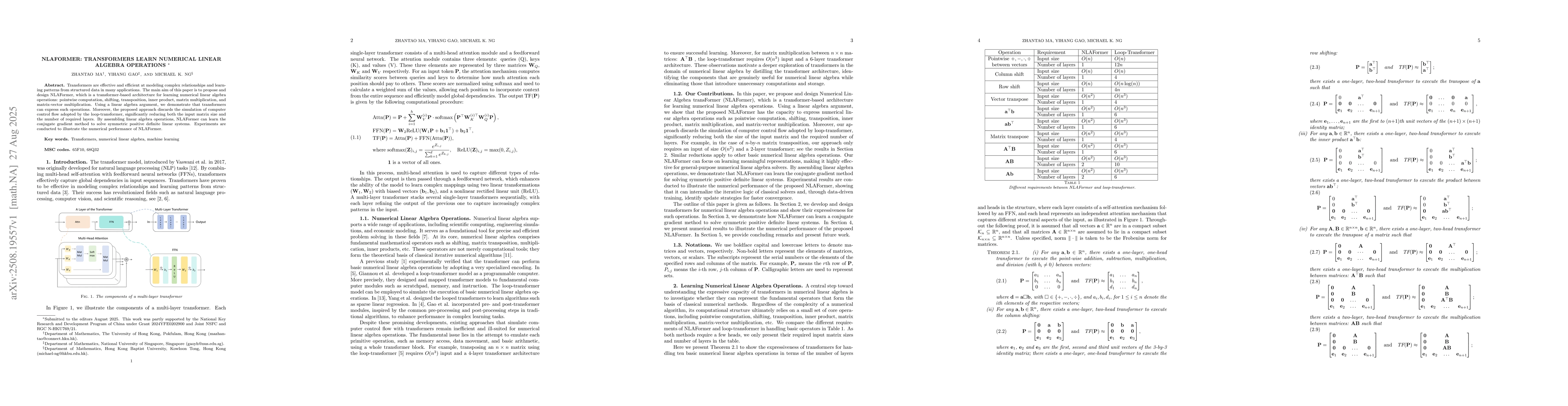 Transformers are effective and efficient at modeling complex relationships and learning patterns from structured data in many applications. The main aim of this paper is to propose and design NLAFormer, which is a transformer-based architecture for learning numerical linear algebra operations: pointwise computation, shifting, transposition, inner product, matrix multiplication, and matrix-vector multiplication. Using a linear algebra argument, we demonstrate that transformers can express such operations. Moreover, the proposed approach discards the simulation of computer control flow adopted by the loop-transformer, significantly reducing both the input matrix size and the number of required layers. By assembling linear algebra operations, NLAFormer can learn the conjugate gradient method to solve symmetric positive definite linear systems. Experiments are conducted to illustrate the numerical performance of NLAFormer.
