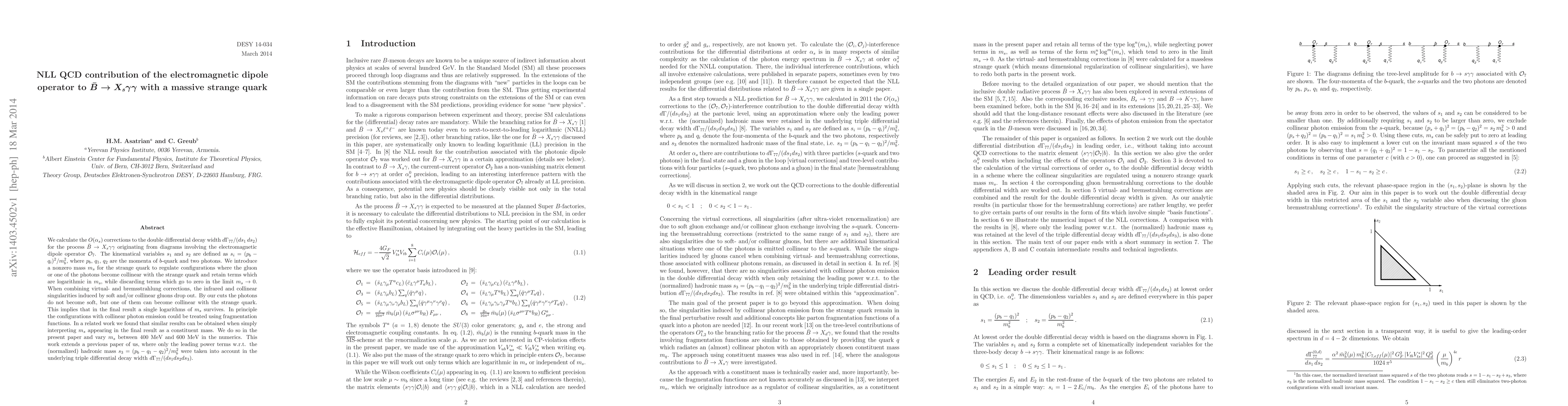 Researchers calculated corrections to a specific particle decay process involving photons and a massive strange quark, using a new method that eliminates infrared singularities, and found a single logarithmic term surviving in the final result.