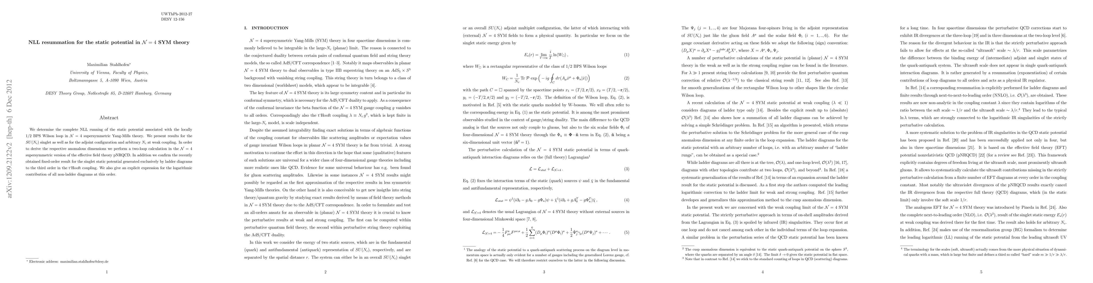 We determine the complete NLL running of the static potential associated with the locally 1/2 BPS Wilson loop in N=4 supersymmetric Yang-Mills theory. We present results for the SU(N_c) singlet as well as for the adjoint configuration and arbitrary N_c at weak coupling. In order to derive the respective anomalous dimensions we perform a two-loop calculation in the N=4 supersymmetric version of the effective field theory pNRQCD. In addition we confirm the recently obtained fixed-order result for the singlet static potential generated exclusively by ladder diagrams to the third order in the t`Hooft coupling. We also give an explicit expression for the logarithmic contribution of all non-ladder diagrams at this order.