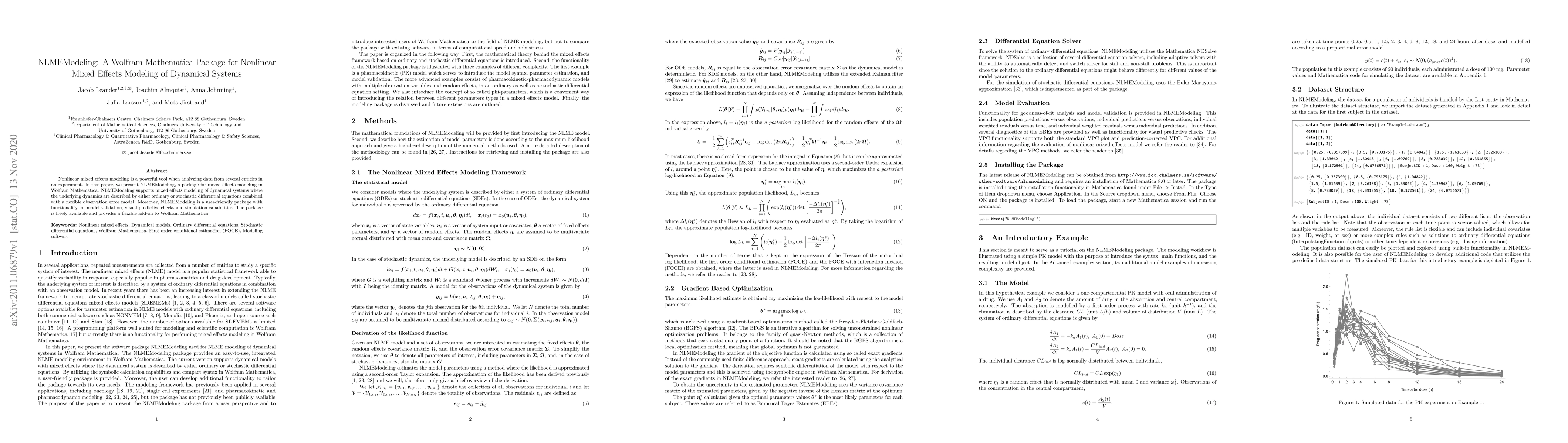 This paper introduces NLMEModeling, a Wolfram Mathematica package for nonlinear mixed effects modeling of dynamical systems, supporting ordinary or stochastic differential equations and flexible observation error models, with features for model validation and simulation. The package is freely available and enhances Mathematica's analytical capabilities.