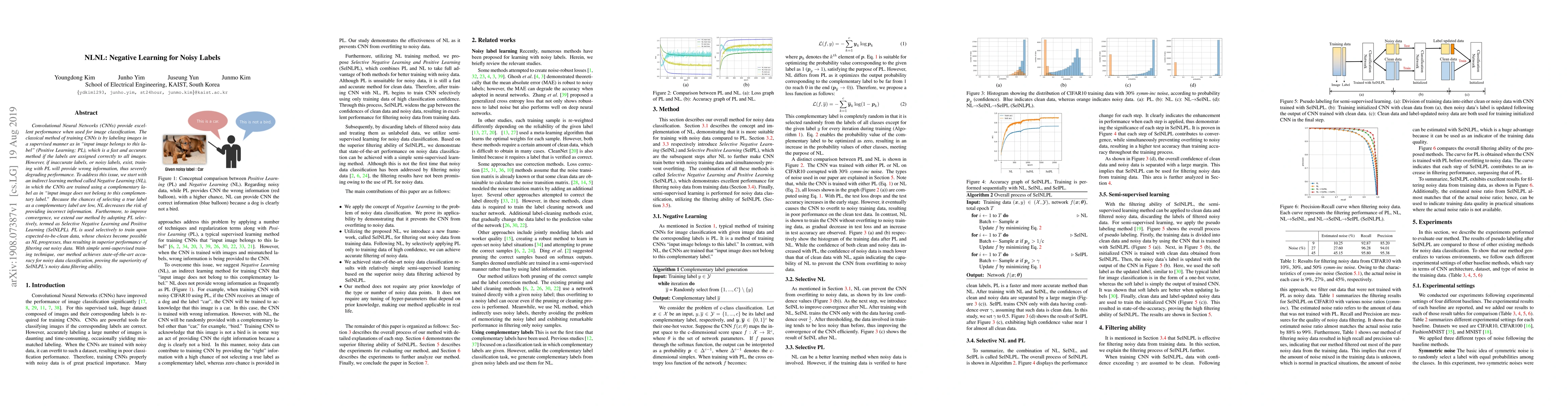 Convolutional Neural Networks (CNNs) provide excellent performance when used for image classification. The classical method of training CNNs is by labeling images in a supervised manner as in "input image belongs to this label" (Positive Learning; PL), which is a fast and accurate method if the labels are assigned correctly to all images. However, if inaccurate labels, or noisy labels, exist, training with PL will provide wrong information, thus severely degrading performance. To address this issue, we start with an indirect learning method called Negative Learning (NL), in which the CNNs are trained using a complementary label as in "input image does not belong to this complementary label." Because the chances of selecting a true label as a complementary label are low, NL decreases the risk of providing incorrect information. Furthermore, to improve convergence, we extend our method by adopting PL selectively, termed as Selective Negative Learning and Positive Learning (SelNLPL). PL is used selectively to train upon expected-to-be-clean data, whose choices become possible as NL progresses, thus resulting in superior performance of filtering out noisy data. With simple semi-supervised training technique, our method achieves state-of-the-art accuracy for noisy data classification, proving the superiority of SelNLPL's noisy data filtering ability.
